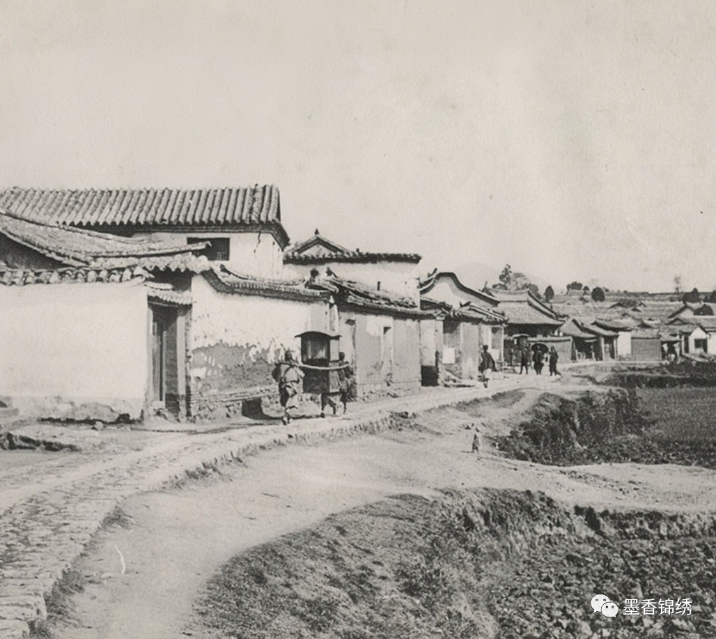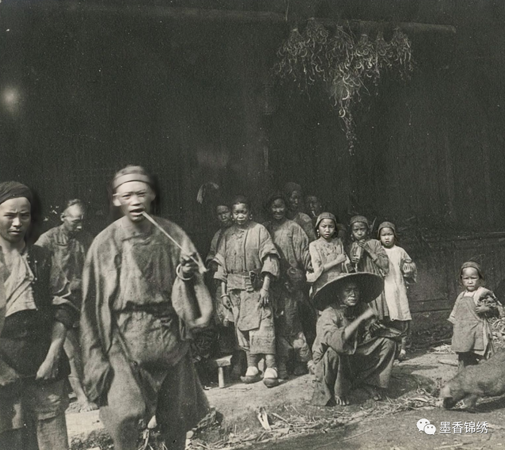 晚清年间云南昆明某乡镇街头的百姓们留影旧照。摄影师方苏雅在传记中描述当时他看到的昆明的街景:道路上泥泞不堪,银群脏兮兮满身泥浆的行人,脸上和身上都是尘土满身。他们都穿着非常宽大的齐膝棉袄,头上戴着黑布条一样的帽子,脚上穿草鞋。整条大街上很难见到衣着华贵的阔佬,妇女们也是灰头灰脸的样子。