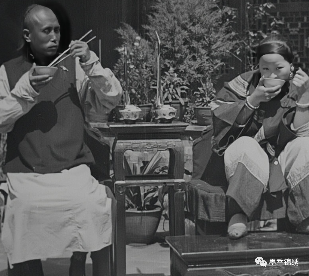 晚清时期一对寻常百姓夫妻在门口吃饭时候旧照,老照片中的年轻夫妻抱起饭碗狼吞虎咽,看起来好像很久没有吃过饱饭。古时候的大米与小麦面粉产量甚低,因此能给饱餐一顿对他们来说实在是难得的奢侈。