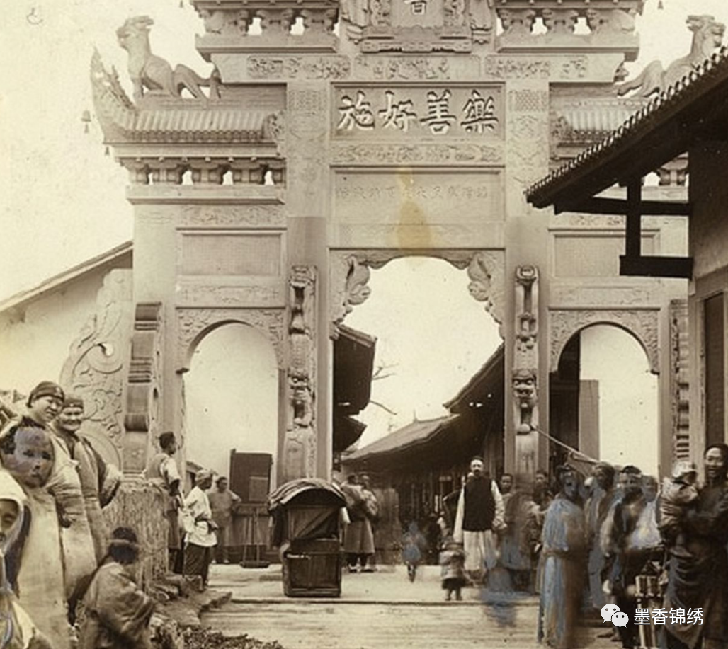 晚清年间四川一带的“乐善好施”的高大牌坊。摄影师伊莎贝拉在进入四川境内后,对当地的人文风貌皆进行了非常深入细致的考察探访。然而因为她是异国之人的原因,她在当地遭受了很多排挤与被拒的折磨苦难。然而不管她经历怎样的围攻,或是被村民的追赶,亦或经历了鼠疫灾难,睡在潮湿肮脏的牛圈中,她却从未有过半分退缩。她利用各种来之不易的机会,将自己看到的所见所闻皆都拍摄记录下来,为后人呈现了关于晚清时期的四川风貌影像旧照。