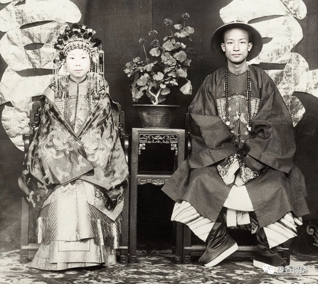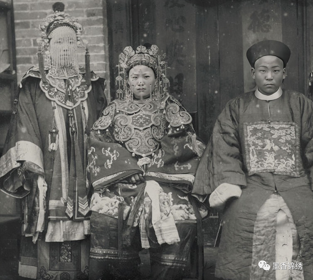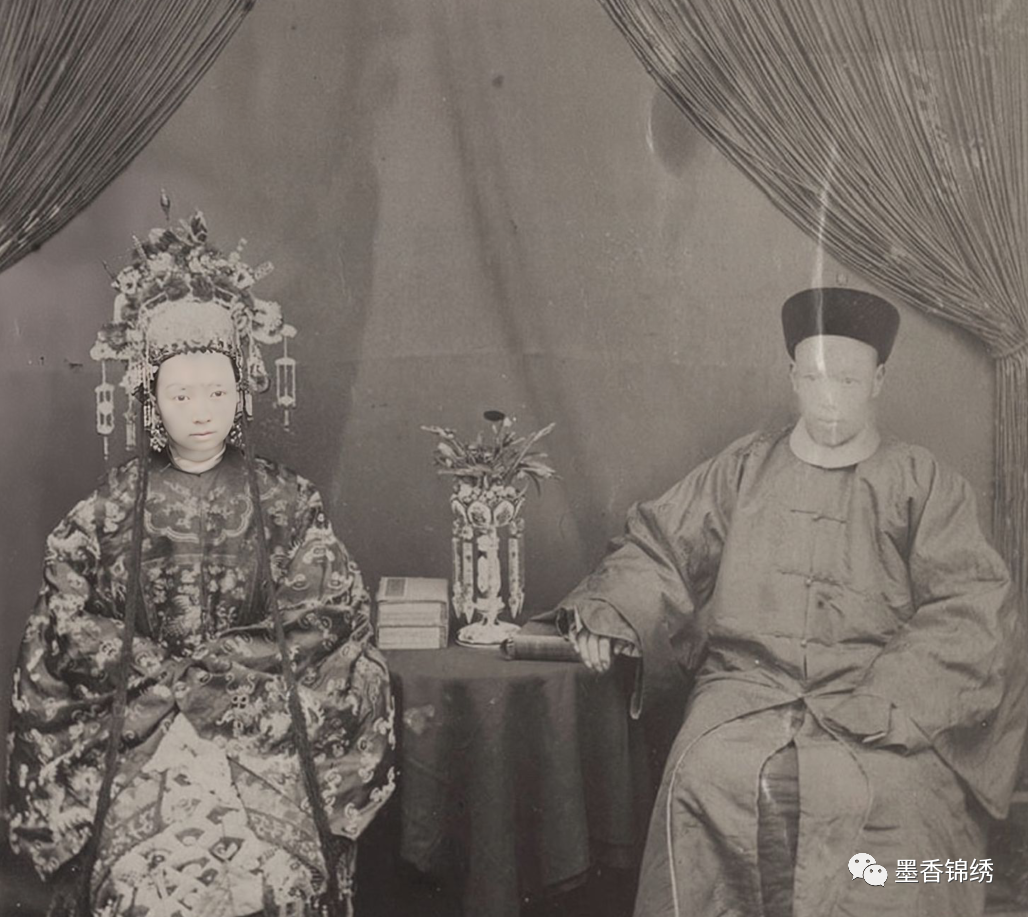 晚清时期京城里的新娘与新郎的合影旧照,古时候人们的婚姻皆是父母之命或媒妁之言,婚庆嫁娶皆是家族长辈打理决定,而地方官府亦是通常不会干预介入。但是若是遇到恶霸抢夺良家妇女、官员纳青楼女子为妾等特殊情况,官府则有权参与其中处理事宜。