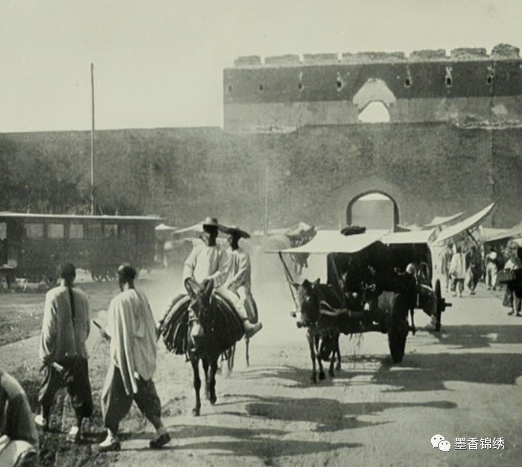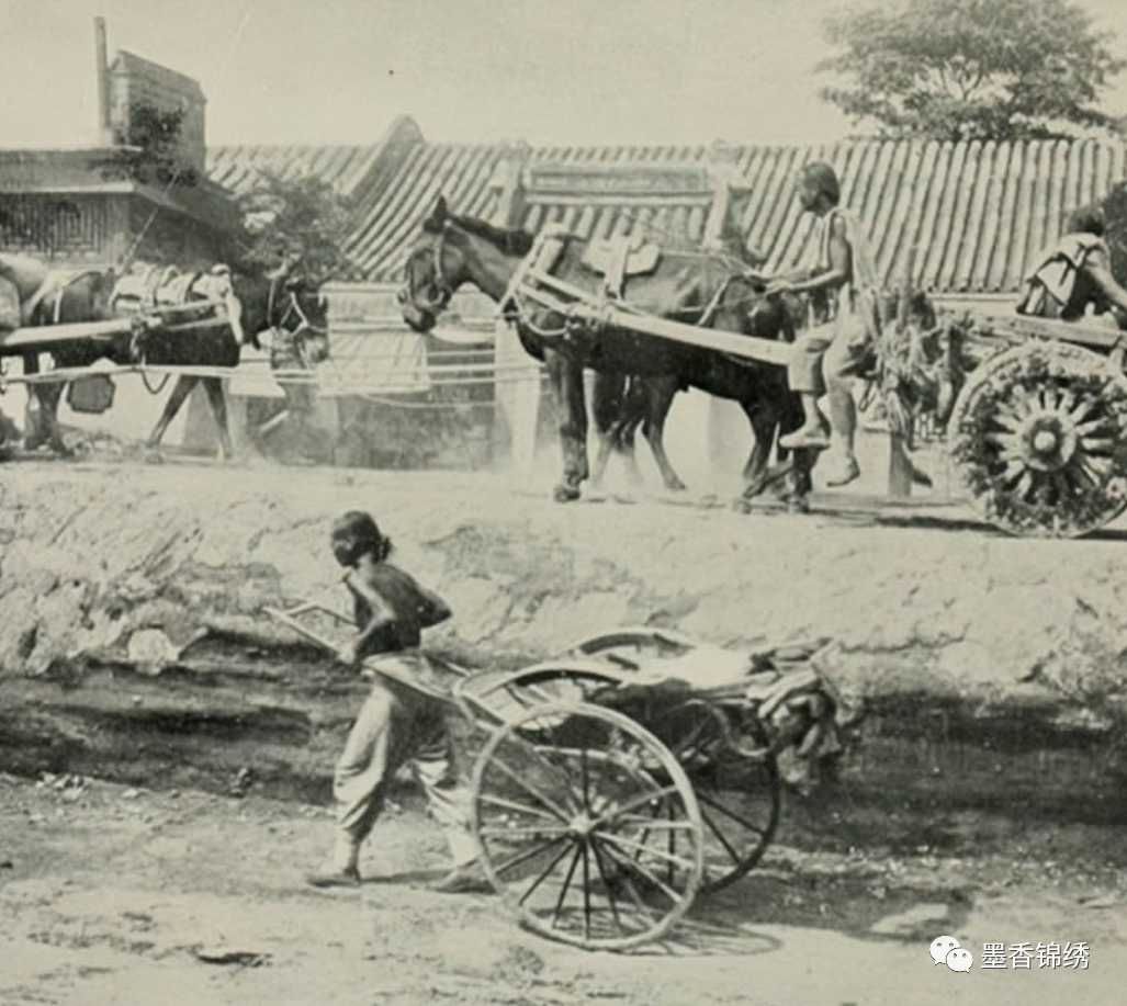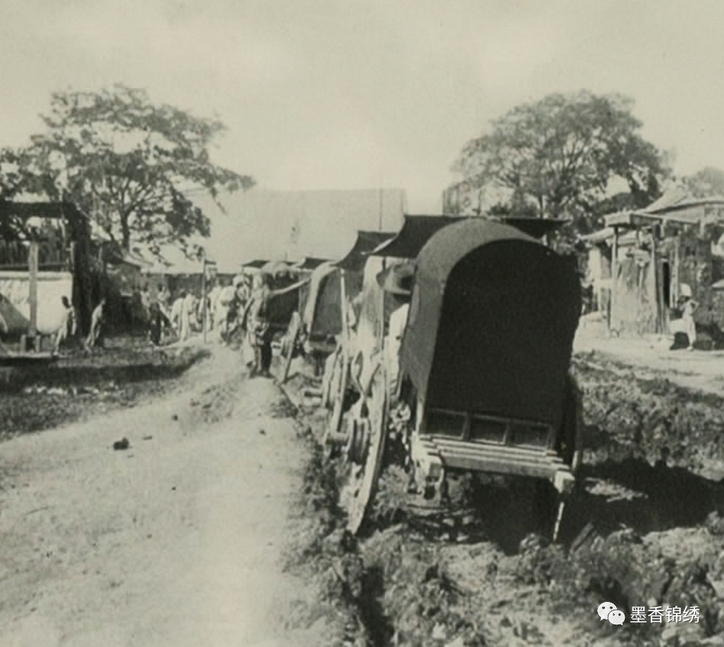 晚清1901年老北京城内的街道旧照,一辆辆马车皆被深陷于泥泞不堪的道路之中。当年探险家伯顿初到北京城时,其实对这座天子脚下的京城并没有什么好印象。伯顿在传记中大发牢骚写道:“此处的道路要么是漫天黄沙般令人睁不开眼睛,要么就是下雨天就被淹没在泥浆之中。”