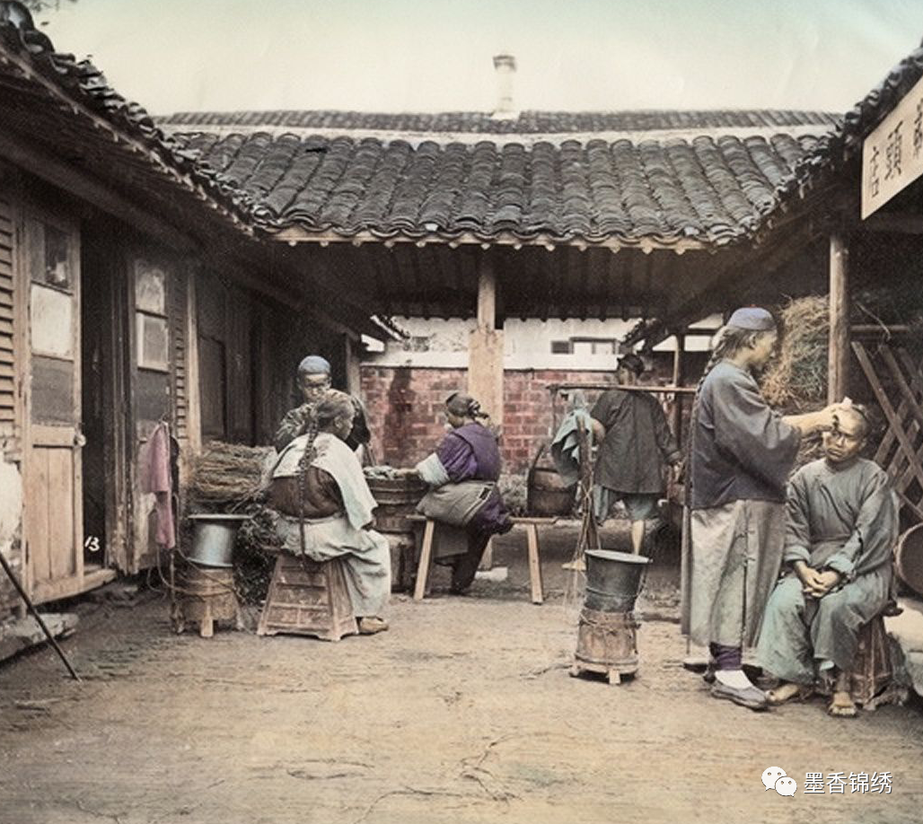 晚清时期大街上的理发摊场景旧照,古时候的剃头匠人并非简单的为顾客理发修辫,其中还包括采耳、按摩、修鸡眼等特殊技能。而且推拿疏通脉络亦是剃头匠的其中拿手绝活,无论是因过度劳累而使得身体酸痛,或是因休息不良而造成落枕颈疼,皆可被理发匠推拿一番而痊愈。
