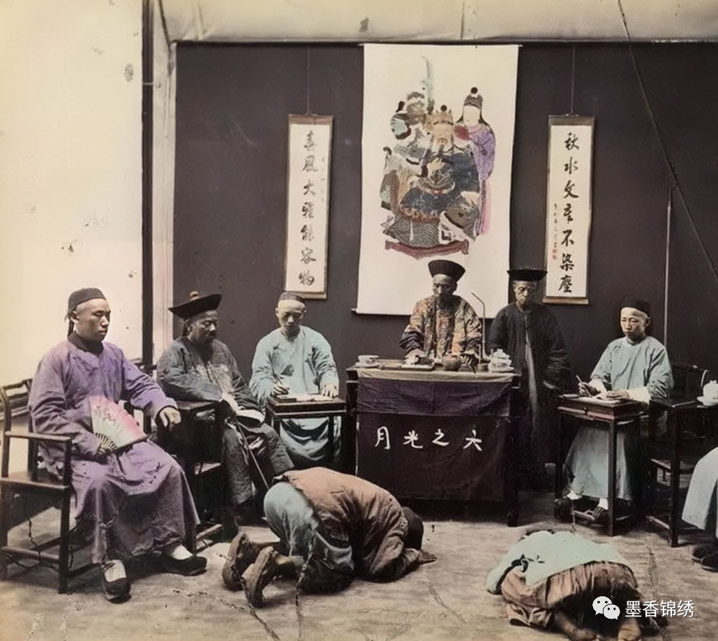 晚清时期七品县官在衙门内当堂审案时罕见旧照,老照片中的场景乃是桑德斯为了拍照与记录而置办的布景。桑德斯对晚清时期的官僚主义甚是奇怪,不解民间所说的“天下衙门皆朝南开,有理无钱亦莫进来”之意,亦是花钱请人摆拍了一些列与衙门官府内审案的情景。