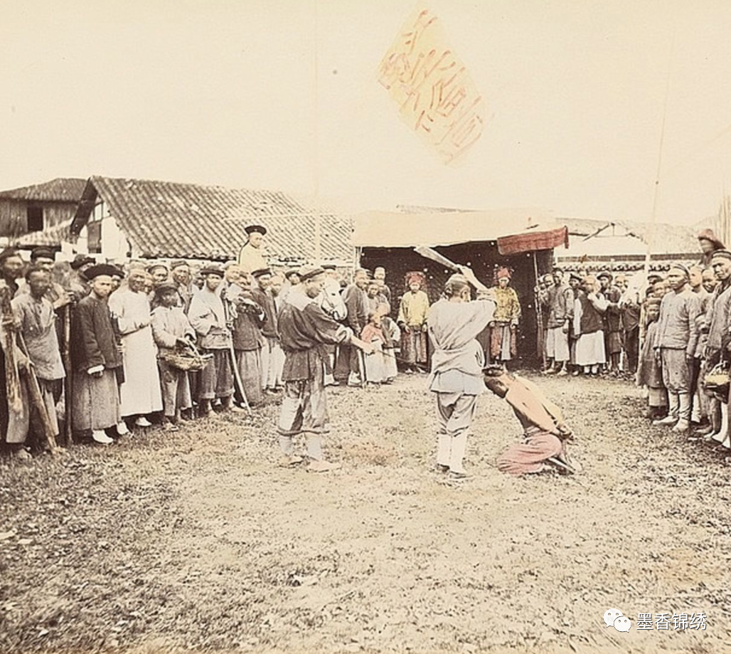 晚清年间的刽子手当场给囚犯执行斩首之刑的现场旧照,老照片中旗帜飘扬,周边围满了看热闹的百姓与行人。按照清廷时期的朝廷律法,通常关于死刑囚犯的案件,初审为州县官府,然后在逐级上报呈送至知府、按察使、督抚复审批阅。待督抚大臣批阅无异议之后,方可向皇帝上书奏报,然后由皇帝勾旨判刑。