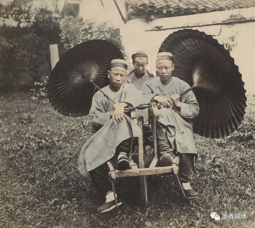 晚清年间一户有钱人家的双胞胎兄弟乘坐独轮车出行时场景旧照。独轮车乃是晚清时期百姓家中最为常见的交通工具,这种方便小巧的独轮车既可以载人出行,亦是可以运输货物。即便是在道路崎岖的羊肠小道上,亦是可以平稳行驶自如。