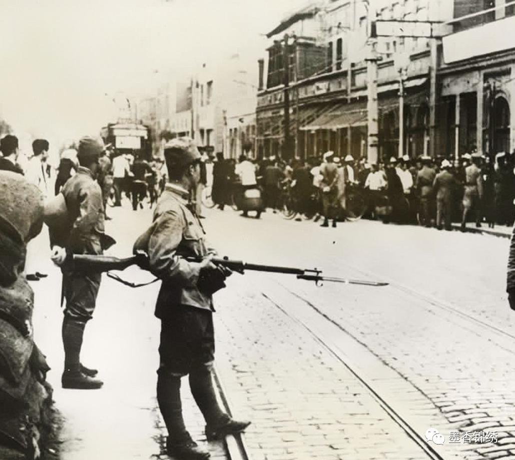 侵略者日军全副武装地持枪监视天津大街上的百姓。于7月30日,狼子野心的日军开始在天津城内进行大扫荡,不断对城里面的商铺与百姓烧伤抢掠,而且将抢不走的物品全部烧光焚毁。于8月1日,罄竹难书的日军才开始停止其集体大扫荡的可怕行为。