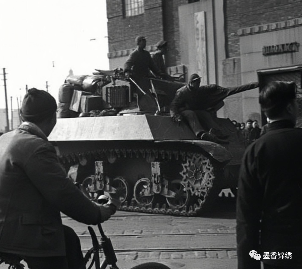 国民党的坦克与军队撤退到南京市时候的留影旧照。于1949年的4月21日,做好万全之策的解放军正式对国民党军队发动了渡江之战,随即以迅雷不及掩耳之势占领了南京境地。而接连败战的国民党政权彼时只能继续向南撤退到广州。