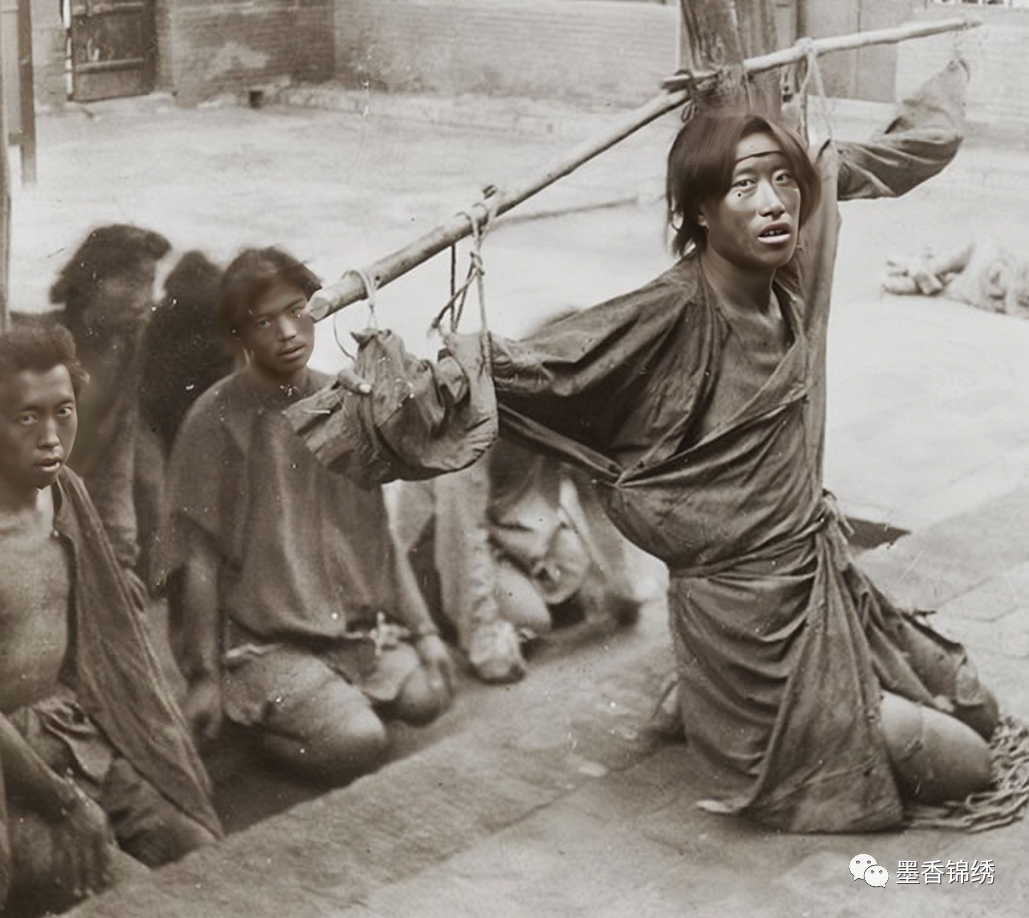 晚清时期一个犯事男子被五花大绑跪铁链的现场照片。彼时正是1900年,被绑的男子因偷盗之事被抓捕,其身后的同伴们已经有人不堪酷刑晕倒在地。其实清朝时期的很多酷刑,有的是地方衙门所创。有的小刑罚虽然不足致命,但是亦是能把人折磨得掉三层皮。