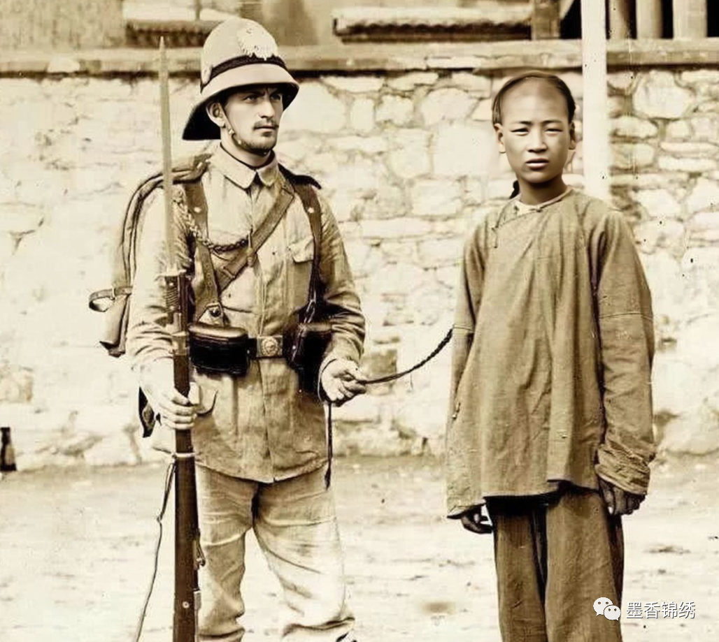 残忍暴力的八国联军士兵戏谑地揪住少年发辫,老照片中的乡村少年不过十三四岁,眼中的恐惧、害怕清晰可见。而该八国联军士兵的此举虽然没有实质性伤害少年,但是却深带羞辱之意。当年那些侵略而来的贼寇之人,经常嘲讽清朝男子的长辫子是“猪尾巴”,因此他们经常上街拉住过路的清朝男子,然后揪住其长辫子嘲讽拍照。