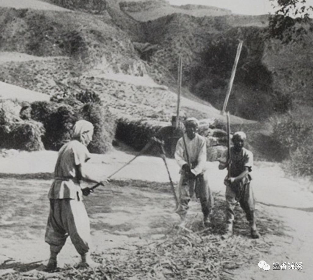 晚清年间山西乡村农民在谷场上奋力扬鞭打稻谷的场景旧照,其实彼时的西方国家早就出现了各种格式的先进机器,而晚清境内的百姓却仍旧还在使用几千年的祖辈用过的简陋农具。罗伯特对当地贫穷落后感到非常吃惊,直言清朝的西北地区乃是最为落后闭塞之处。