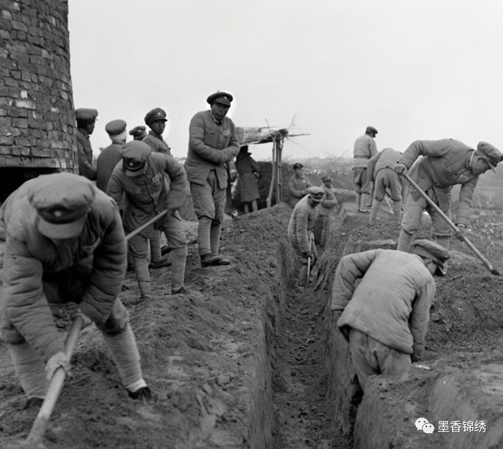 国民党军队士兵们在挖掘战壕时的现场老照片。当年李仙洲集团受蒋介石之命,于是带着三个军攻打莱芜与颜庄一线之地。然而没想到陈毅等人看准时机,于2月18日之时直接攻进莱芜附近,直接将李仙洲的主力部队进行了围剿之战。