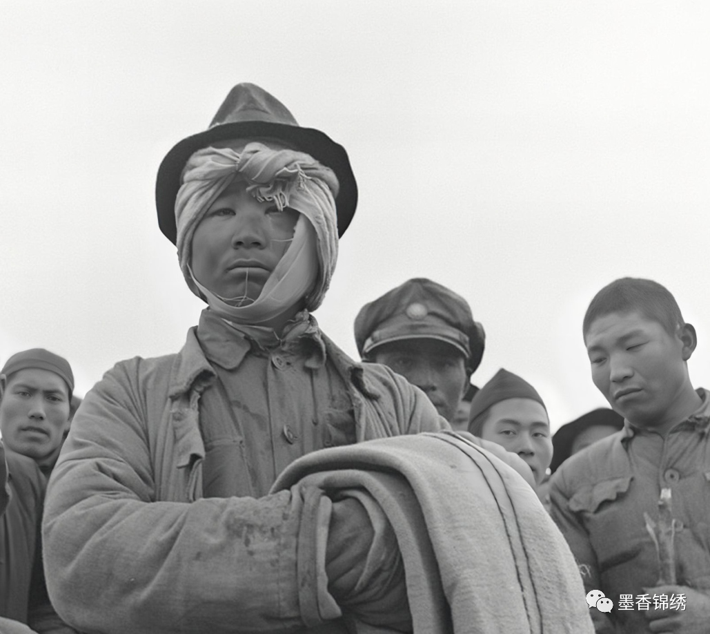 国民党军队中一位受伤的士兵留影旧照,眼神中满是绝望、悲愤的神情。自从当年的华东野战军因不敌日军攻占而放弃山东临沂,从而让蒋介石以为华东野战军无实力抵抗日寇,于是连忙下令让李仙洲集团和欧震集团将东野战军歼于莱芜之地。