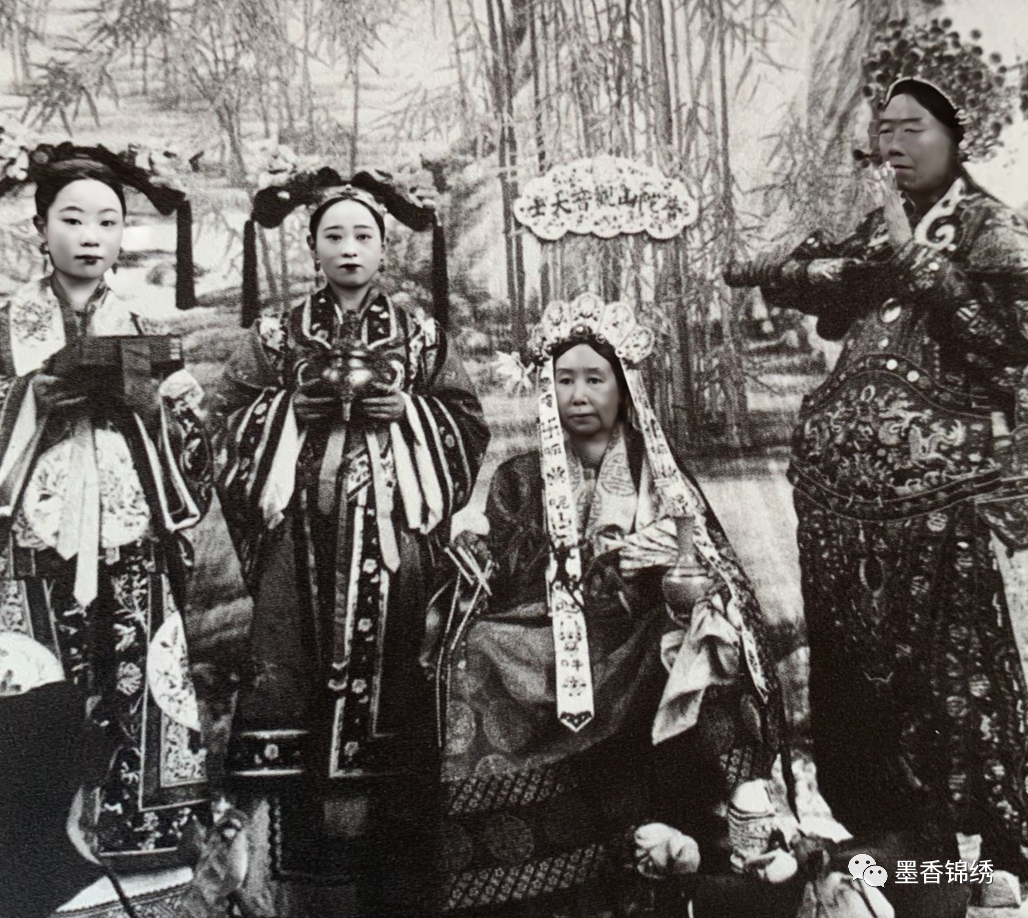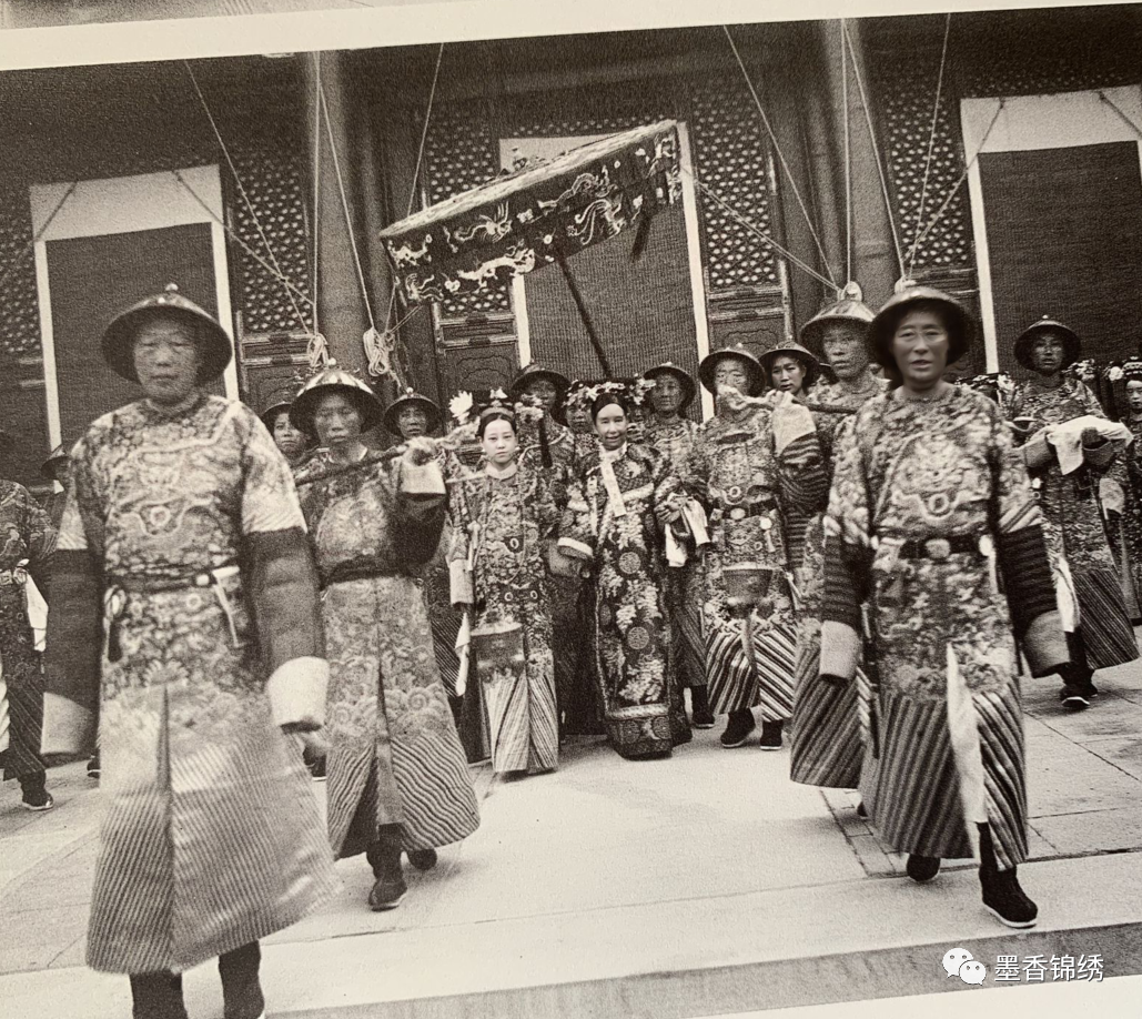 慈禧太后在皇宫里与其他嫔妃、太监、宫女等人的合影旧照。根据晚清掌事宫女德龄在自传中记录讲述,慈禧太后平时在后宫接见贵客之时,喜欢佩戴玉镯和宝石戒指。另外其右手的中指与小指上戴着金护甲,左手则戴着玉护甲,以彰显其身份地位尊贵。