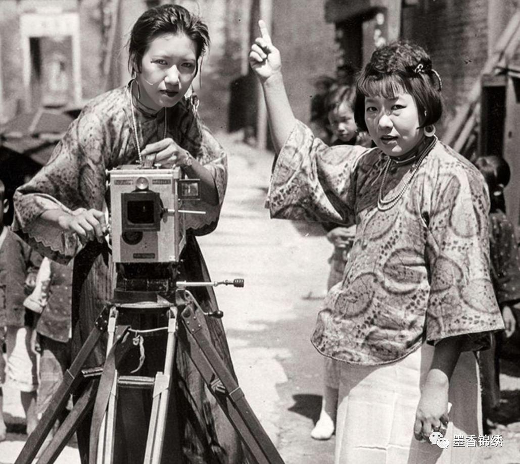 民国1925年的广州,一位眉目惊艳的女摄影师和助手在街上的留影瞬间。老照片中的女助手正在打手势,引导等待照相者摆好姿势等等。