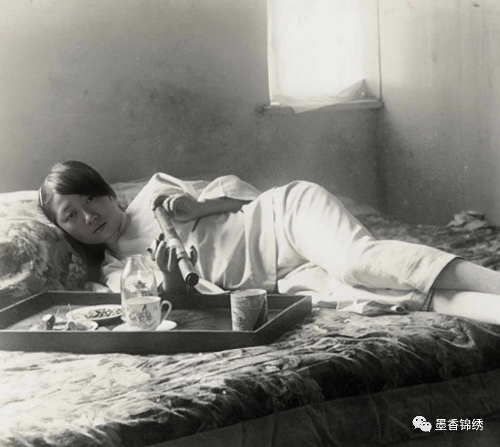 民国1924年时期,一个青楼娼妓抽鸦片时醉生梦死的留影旧照。那个时代的照相机虽然是奢侈品,而且拍摄照片费用十分昂贵,但是人们对于照相深有好奇之心。当时无论是家境富裕的达官贵族,但是身居寒屋的无名小卒,皆喜欢拍摄留影于生活中瞬间。而本组民国时期的历史老照片,亦是非常真实而细节地展示了不同女性的气质与风貌,以此一窥,亦是可以感受、领悟那个时代女性们的风采与精神。