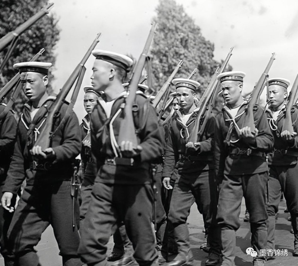 晚清朝天的海圻号军队在登陆美国纽约时现场照片。其实自甲午战争后,清朝政府痛改前非重新组建了西方式的海军部队,甚至不惜花费重金到全国各地去购买军舰等海上装备武器。而本组启程去美国纽约的海圻号,乃是当时从英国置办回来装备最为先进、吨位最大的旗舰。旗舰号上的统领名叫程璧光,舰上一共有445名清朝海军。