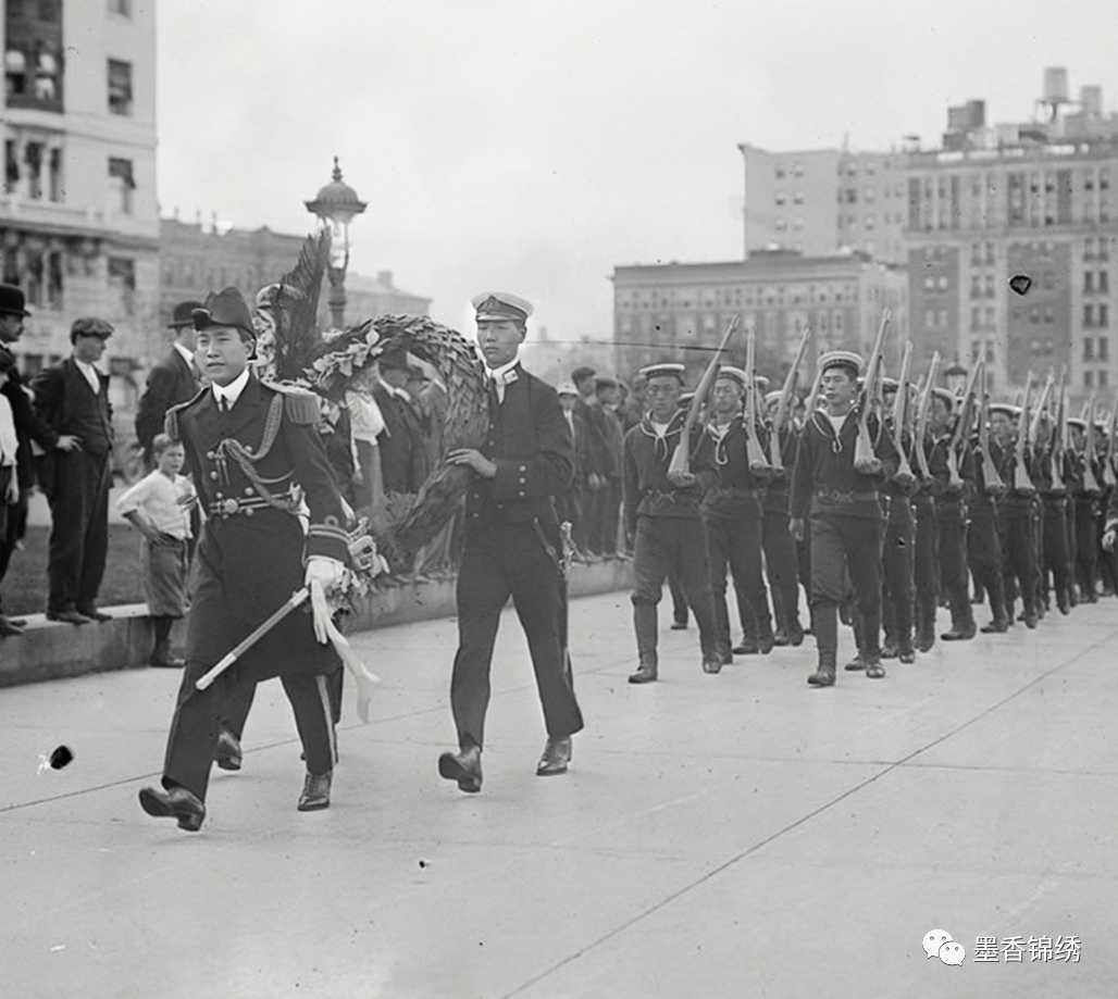 晚清的海圻号军队官兵们抵达美国纽约后,全体向已逝的美国总统格兰特敬献花圈时的现场照片。据悉当年晚清海上将军程璧光率部到美国首次访问,迅速在美国引起了强烈反响。当时不少美国政界人士、商界大亨等等皆怀着不同目的,主动想要去认识、结交海上将军程璧光。