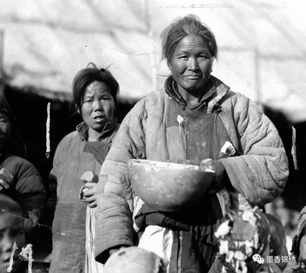 后来很多地方的草皮、树枝都被人们吃光一空,漫山遍野皆是饿殍满地、人烟空绝。1927年的秋季,沿途皆是受灾饥饿的百姓,一户穷人家的婆婆与儿媳对着前来采访的摄影师笑脸相迎捧碗乞食,满眼皆是惶恐不安的神情。