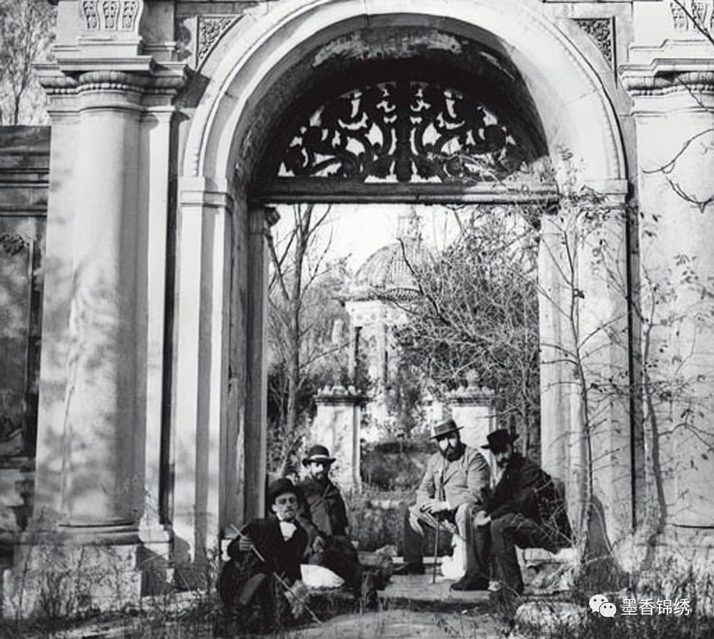 晚清1873年时期,恩斯特等一行人进入圆明园拍照,身旁还有几个外国人耀武扬威地留影。此地乃是圆明园内的西洋楼花园门前,亦是慈禧太后曾经最为喜爱的盛夏纳凉之地。其实当年圆明园在经历两场浩劫后,大体的建筑结构还算得以保存,不过一些精美 的木质房顶皆被烧毁一空。