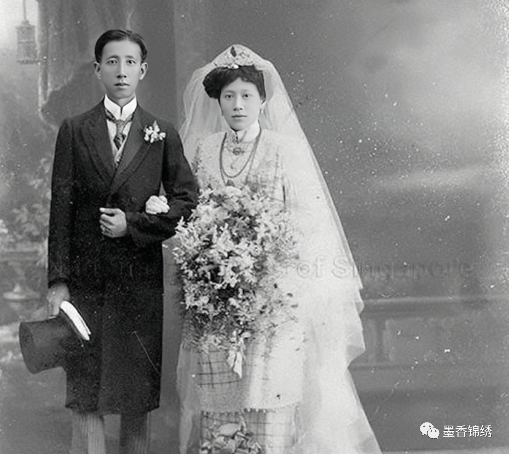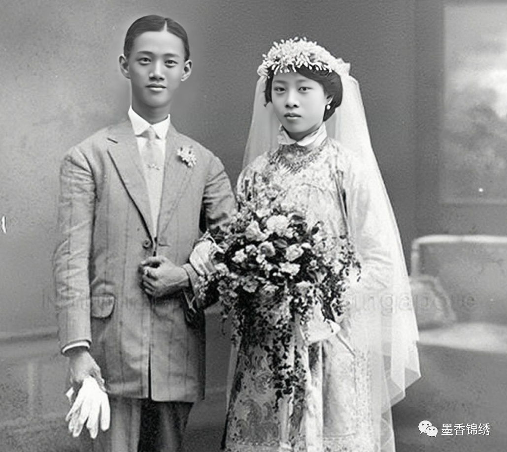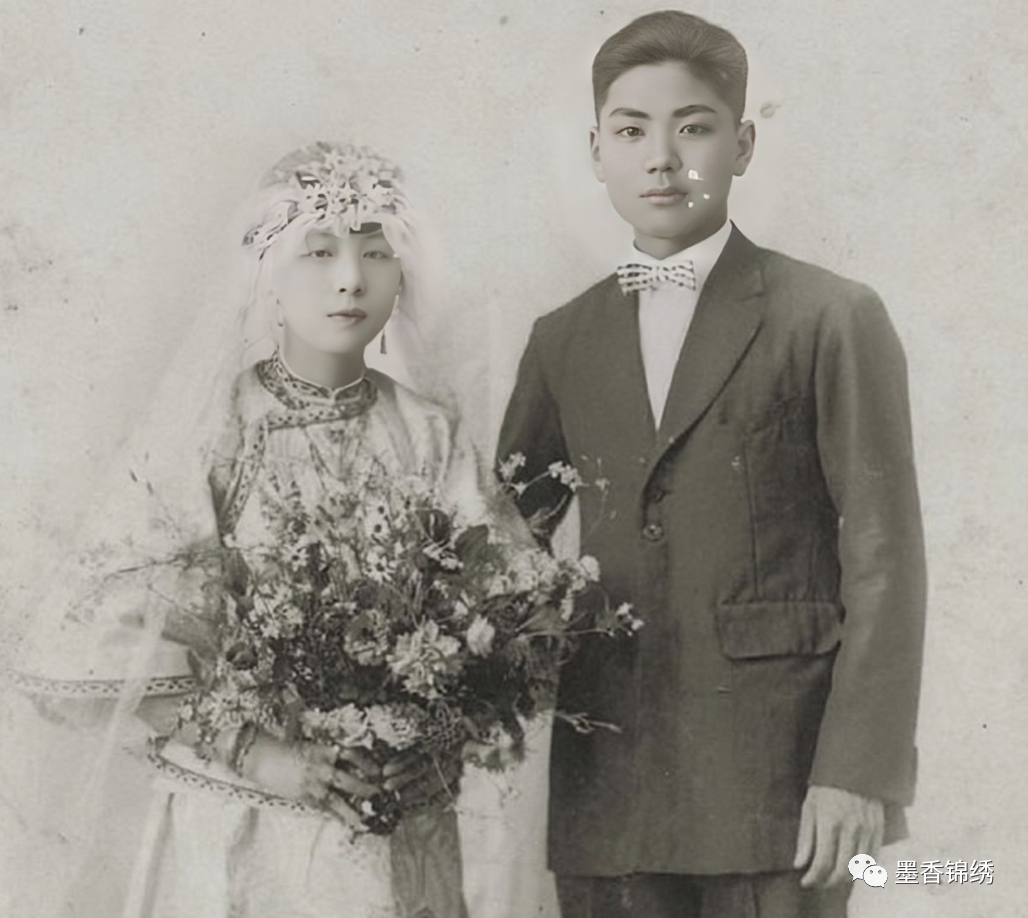 1921年的成亲小夫妻肖像合影。早在晚清末年开始,西方人唯美、浪漫的婚嫁方式就开始逐渐流行与中国。特别是在天津、广东等大城市,随着外国人越来越多的影响,很多家庭亦是开始出现了在教堂结婚、出嫁等文明方式,亦是将原本红色喜庆的婚嫁服饰改成了洁白的婚纱与燕尾服。