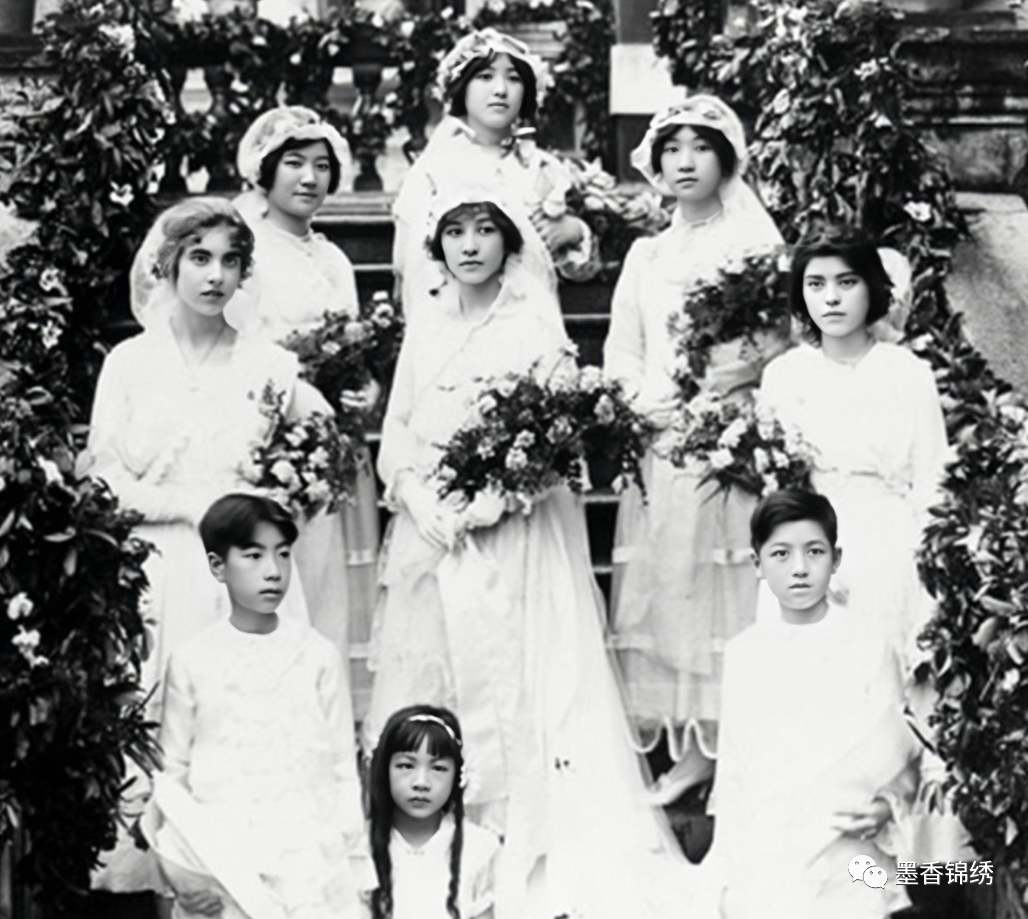 民国1915年时期,一位即将出嫁的美丽新娘与伴娘们合影旧照,老照片中伴娘们燕瘦环肥各有惊艳,其穿着打扮与新娘大体相同,在婚礼上似乎抢了新娘的风头。西方人结婚一般以白色为圣洁理念,因此结婚时的服饰通常为白色婚纱。