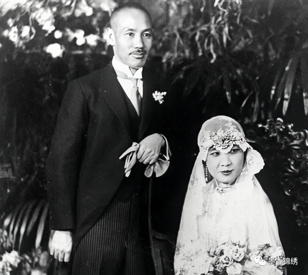 民国1927年的12月1日之时,蒋介石与宋美龄郎才女貌的结婚照合影。老照片中的蒋介石英俊伟岸,身穿着黑色燕尾礼服、手戴纯白手套:而其新婚妻子宋美龄则是穿着一身华美、浪漫的气质婚纱长裙,手中捧着一束康乃馨鲜花。两人眉目温润微笑缱绻,乃是世人公认的郎才女貌之人。
