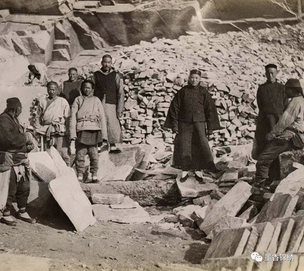 1910年江苏海州石料场,一群苦力在工作、搬运时的场景旧照。晚清时期施行的新政,其实大部分经费都是从底层百姓手中收取,而且这些经费、政策、措施却皆用于城市建设,被交赋税乡村百姓却并未享受到任何便利与好处。