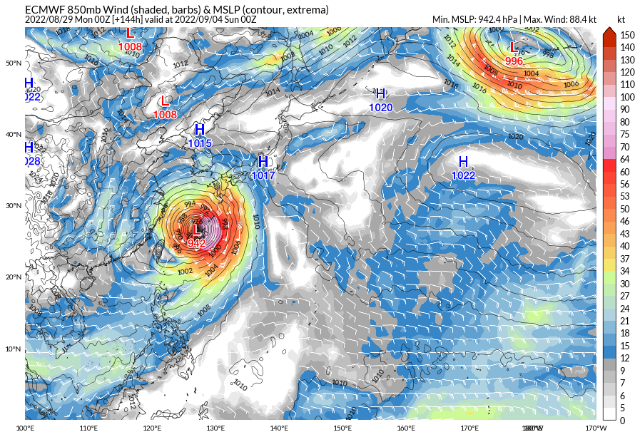 而在北上过程之中,短时间来看,EC预计还会持续增强,这就是我们说的可能达到17级以上超强台风的可能性。