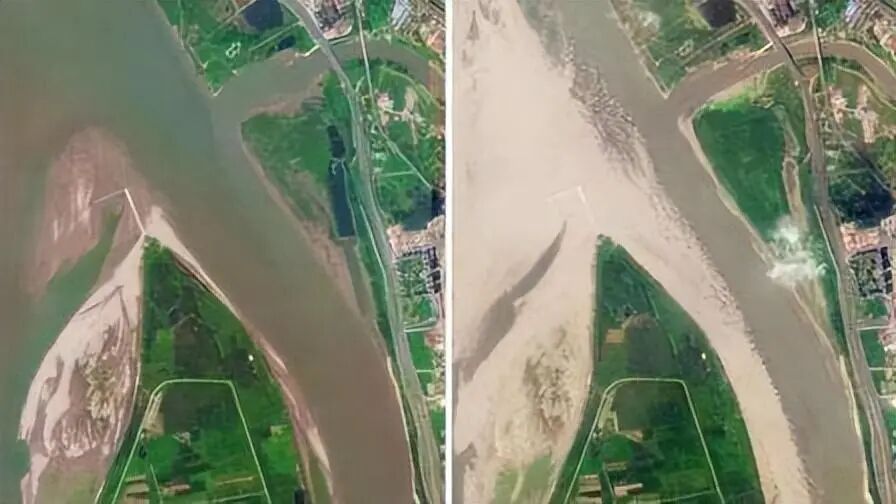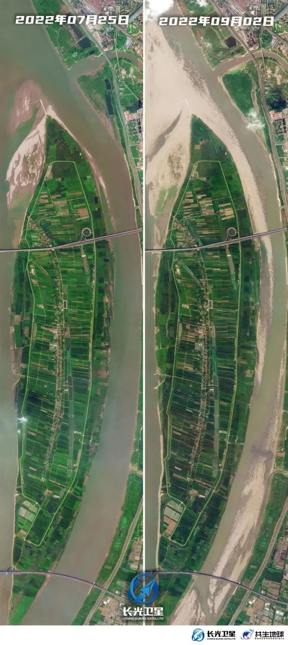 对比今年7月的卫星图像对比,也是明显可以看到长江水位明显下跌。所以说,水源是处于完全紧缺的状态。
