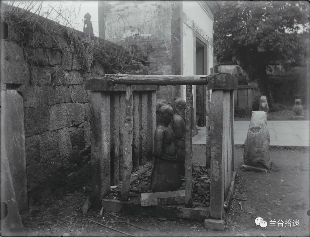 弗利尔照片中的围栏,左右两侧已经风化垮塌,一侧用三根木柱代替石栏,起到一个加固和避免前后石栏的倒塌的作用。墓阙另一侧的铸像石栏也存在同样的问题,照片中侧面的石栏已改成一块青石板。