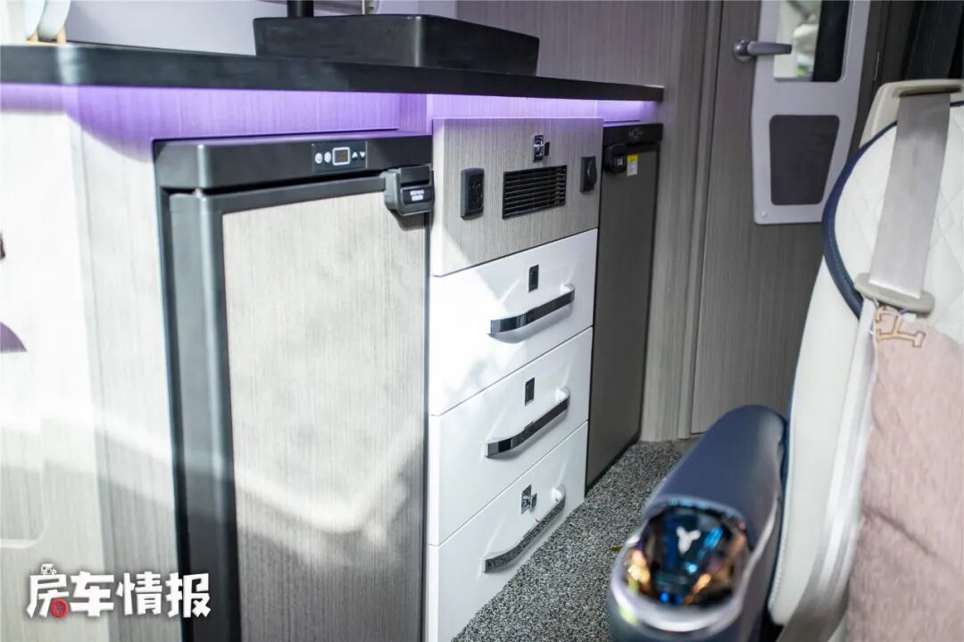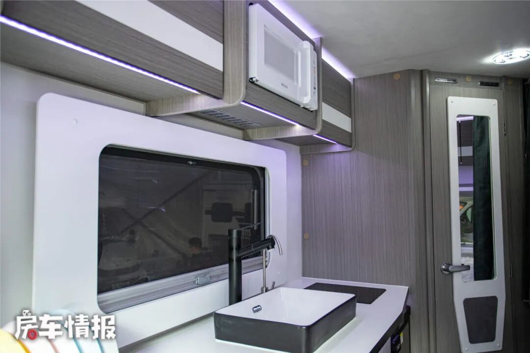 位于操作台上洗手池旁边还有一个小型出水口,这个是车上的直饮水系统,通过内置的净水装置可以直接饮用,这对于长期在外旅行的家人来说,还是很有必要的。