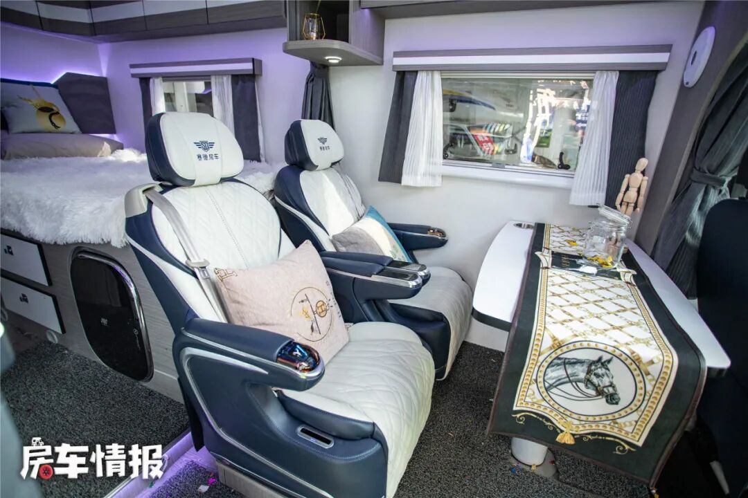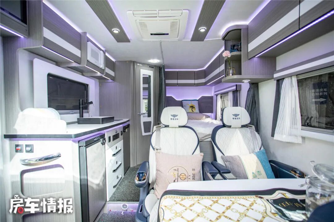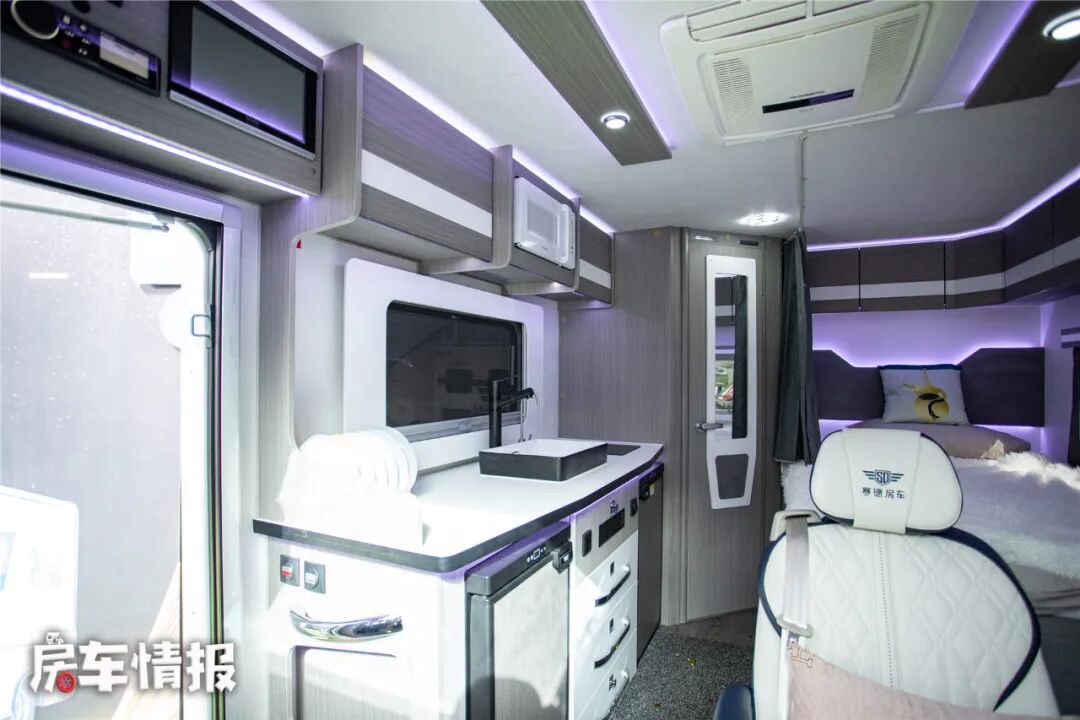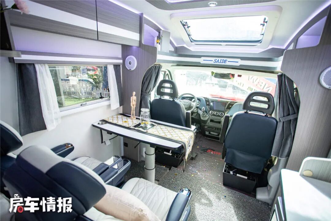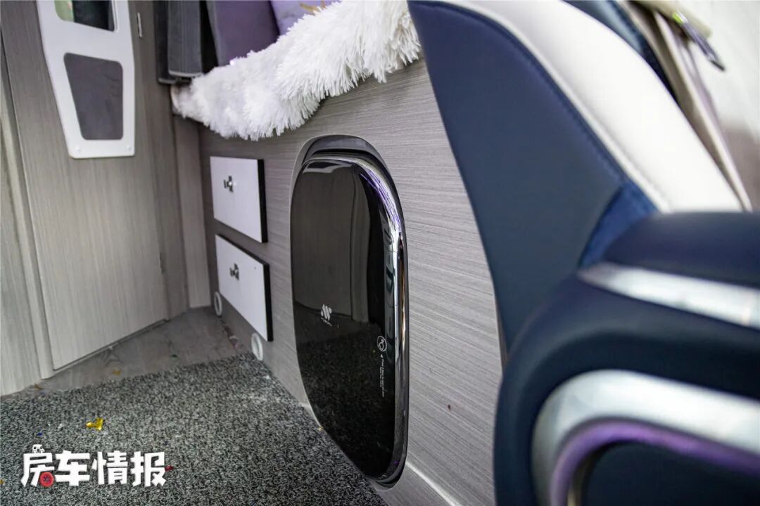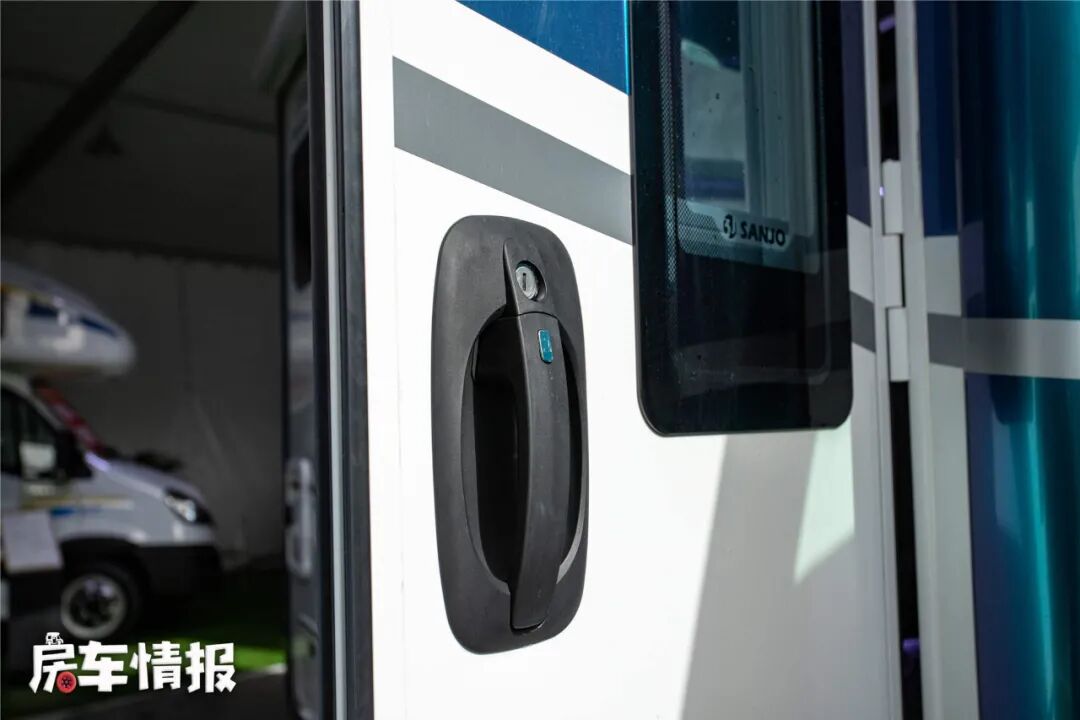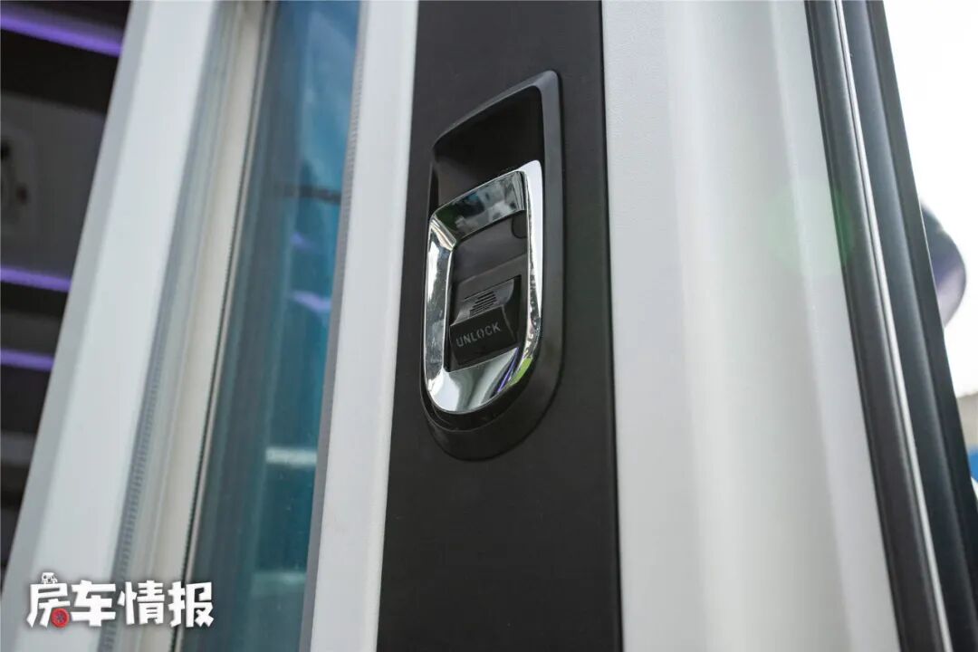 在进入车厢内部时,可以看到车厢中门也是暗藏玄机!不同于常见的机械式车厢门,这款新车使用了一个智能车厢中门,带有电动吸合、一键进入等功能,要知道电动吸合门可是在高端豪华家用车上才会出现的,现在使用在了房车上,挺令我惊讶的。