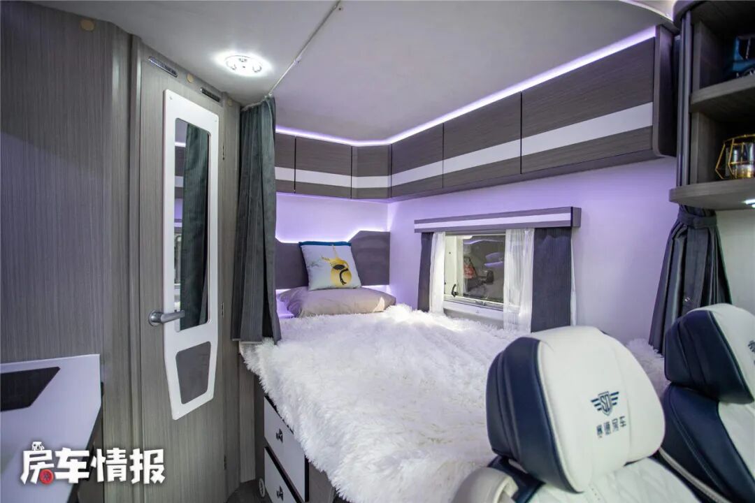车厢另一侧是车内的著休息区,一张纵置双人床,尺寸还不错搭配乳胶床垫,能够为2人提供不错的舒适性,如果出行是一家4口的人,后期也可选装一张电动升降床。