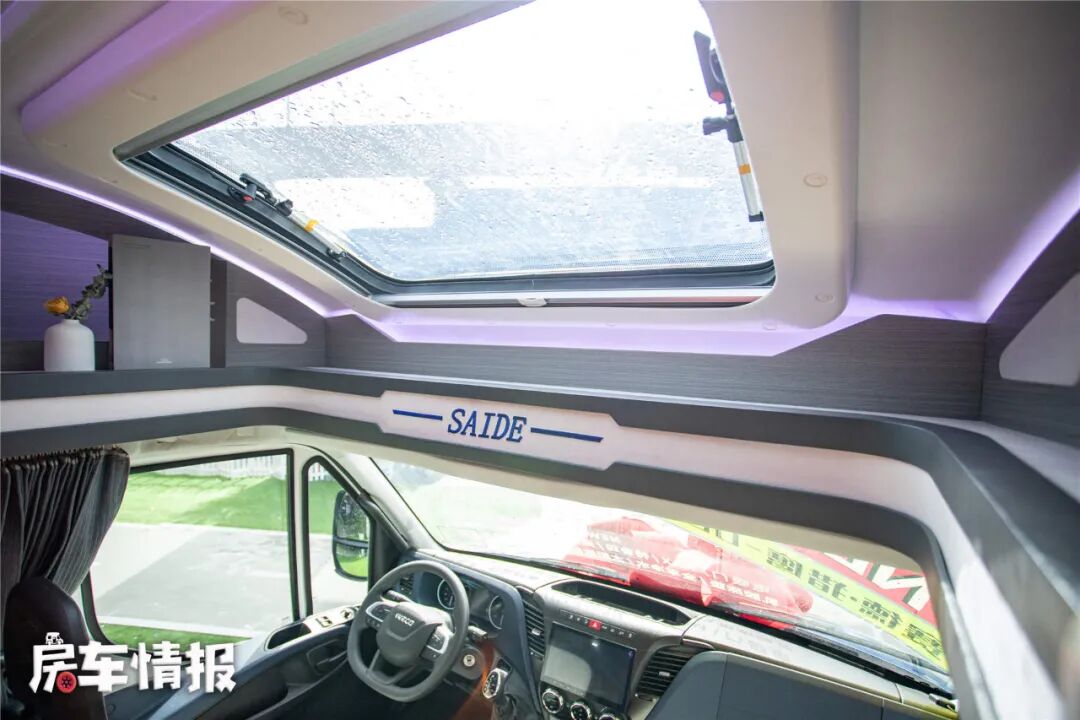 由于车身采用的小额头设计,在驾驶室上方并没有出现额头床,取而代之的是一个开放式的储物空间以及一扇尺寸挺大的天窗,阳光透过窗户刚好照在航空座椅上,日常使用很惬意。