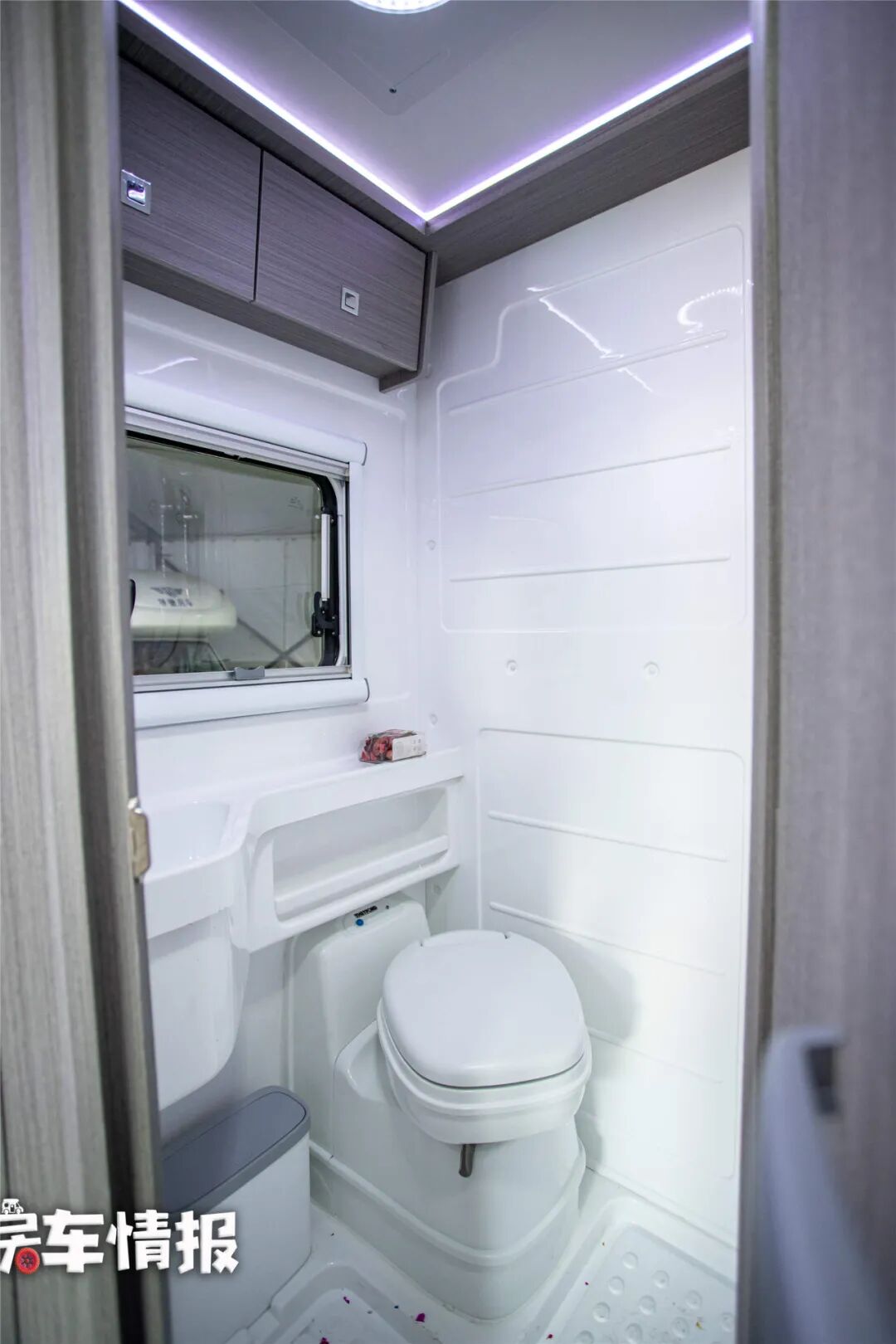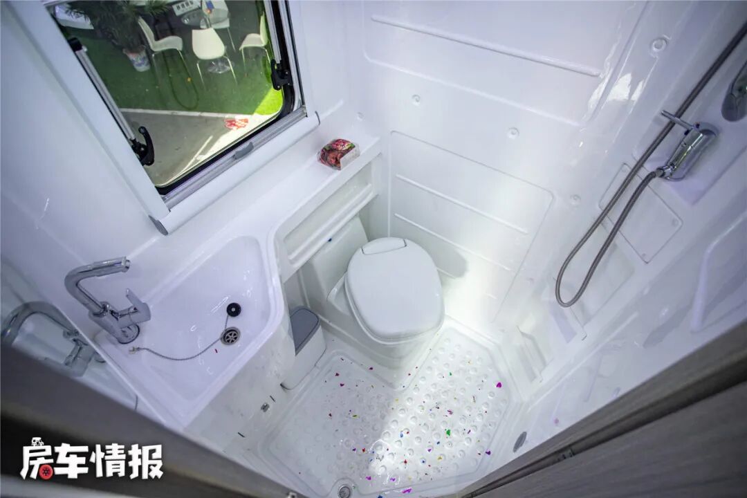 卫生间位于车厢尾部,内部空间表现还不错,提供了盒式马桶、换气扇、淋浴、洗手池等基础设备,对于日常使用来说还是没有问题的。