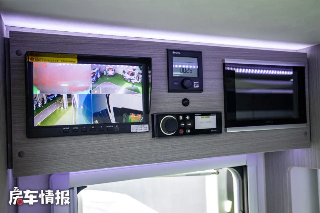 位于车厢中门上方提供了一组车内的控制面板可以便于控制车内的电器,另外这里还提供了全车四路监控,可以在车内实时观看车外的情况,提升驻车安全性。