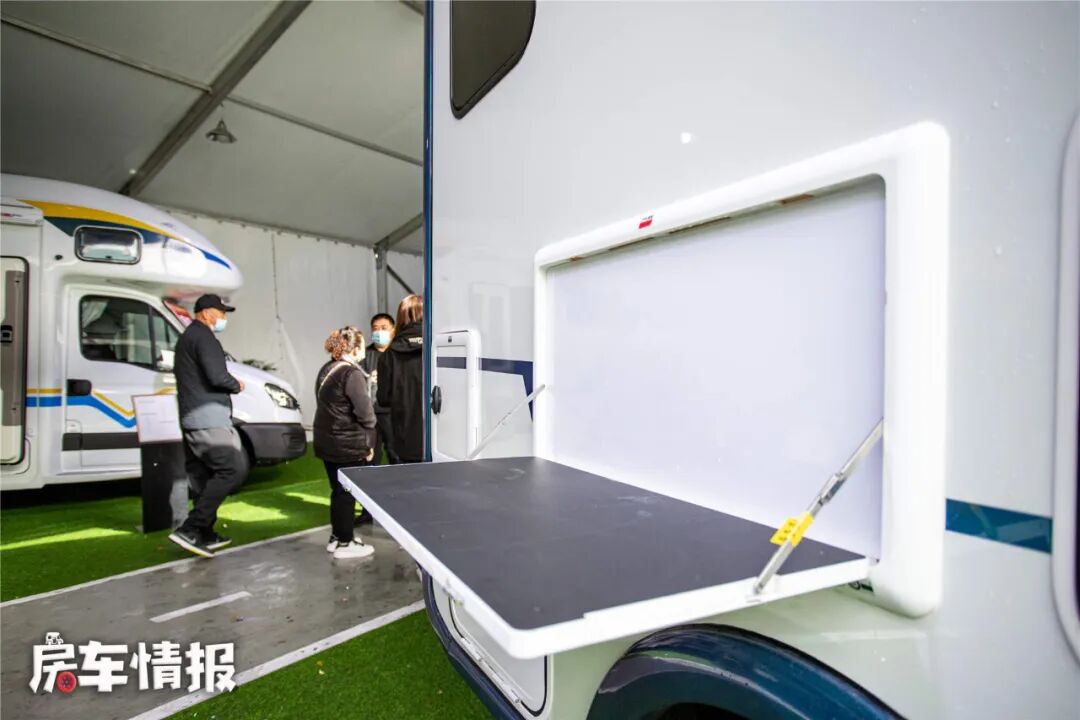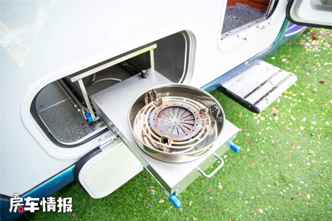 车身外部也提供了丰富的外部设备,常见的遮阳棚、电动踏步、外置置物翻板、储物柜、抽拉燃气灶等一应俱全,并且在车外我们还看到了新能源取电口,这也就意味着在外旅行时可以使用家用车充电桩补充电源。
