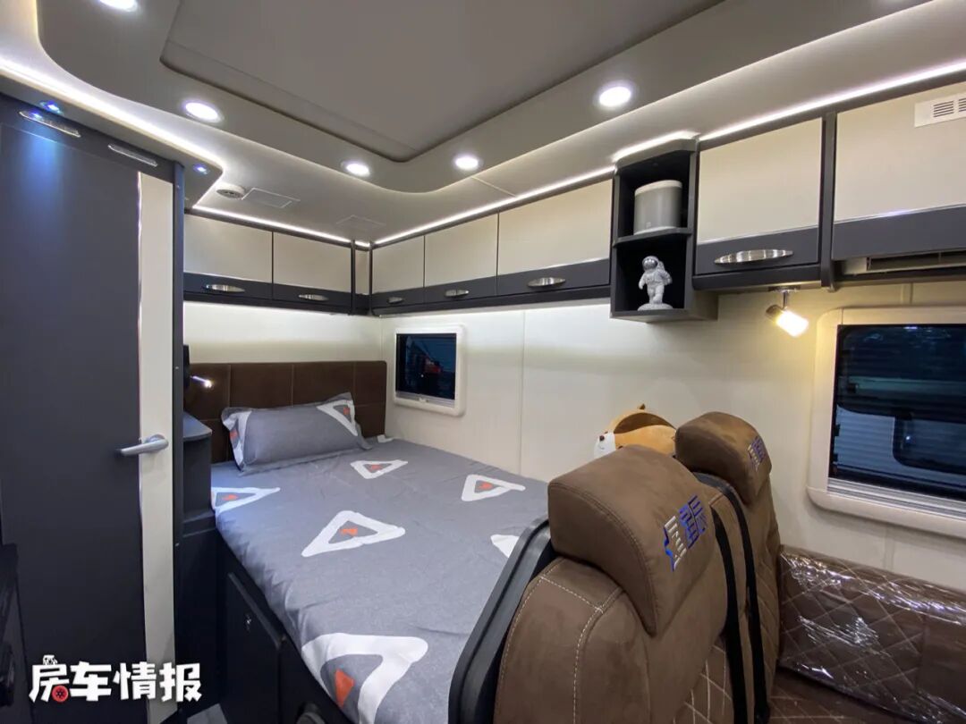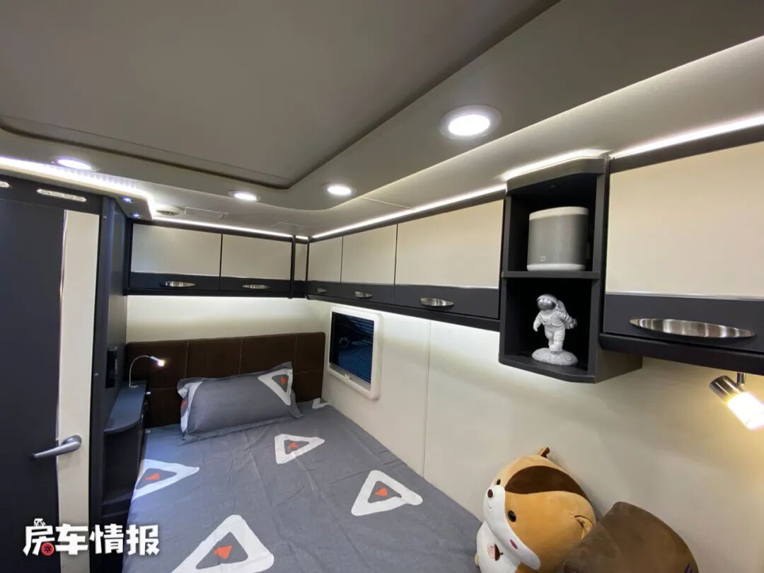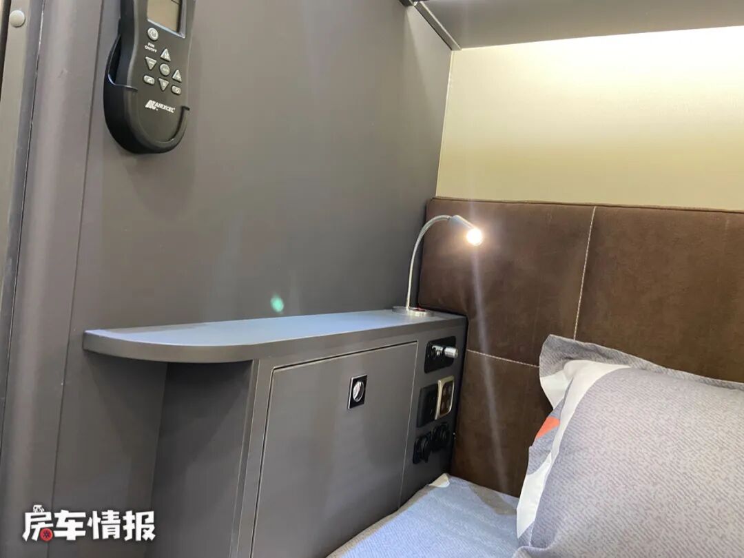 尾部的休息区内提供了一张纵置的双人床,尺寸为1950mm*1280mm,也完全可以容纳两个人睡觉休息使用。床头处还加入了一个夹缝床头柜的设计,提供了小夜灯、储物柜、充电接口等,方便平时使用。