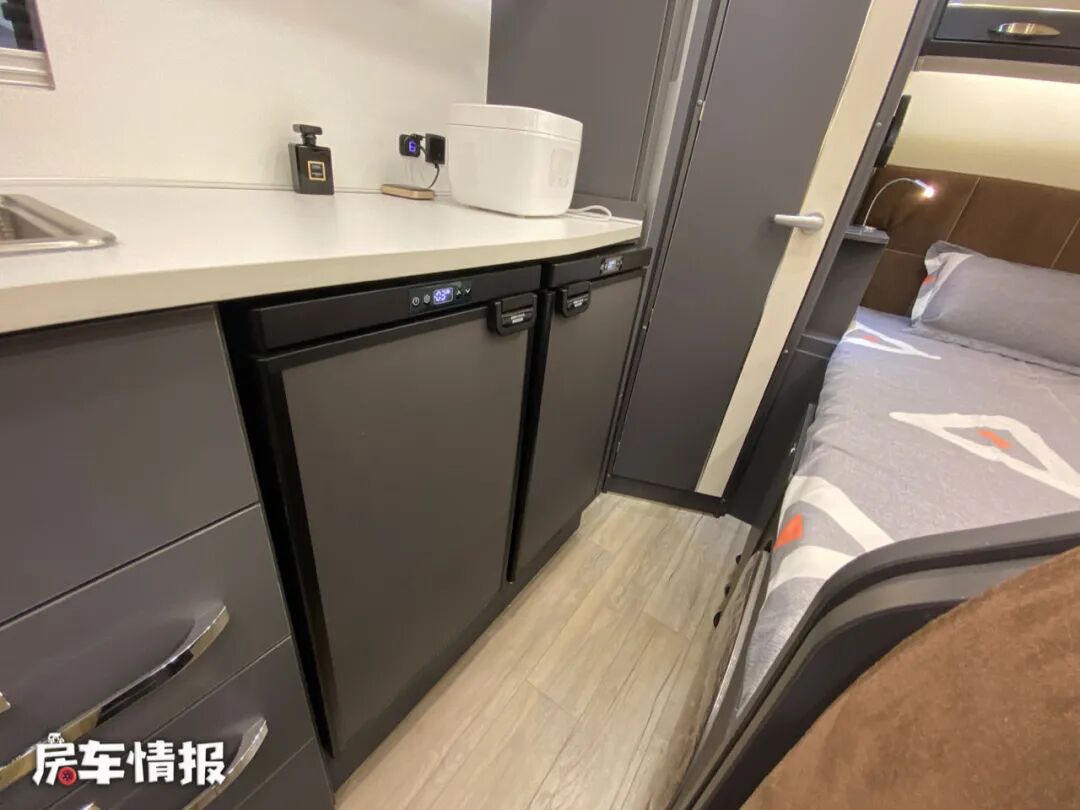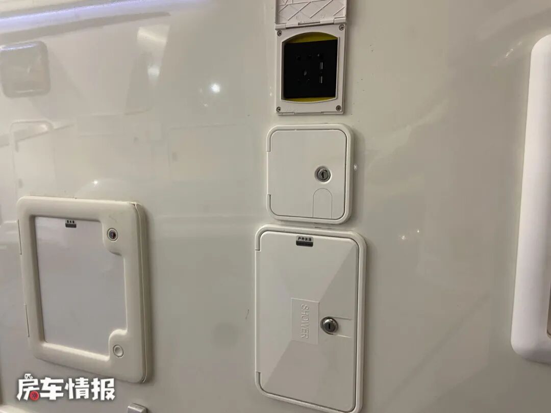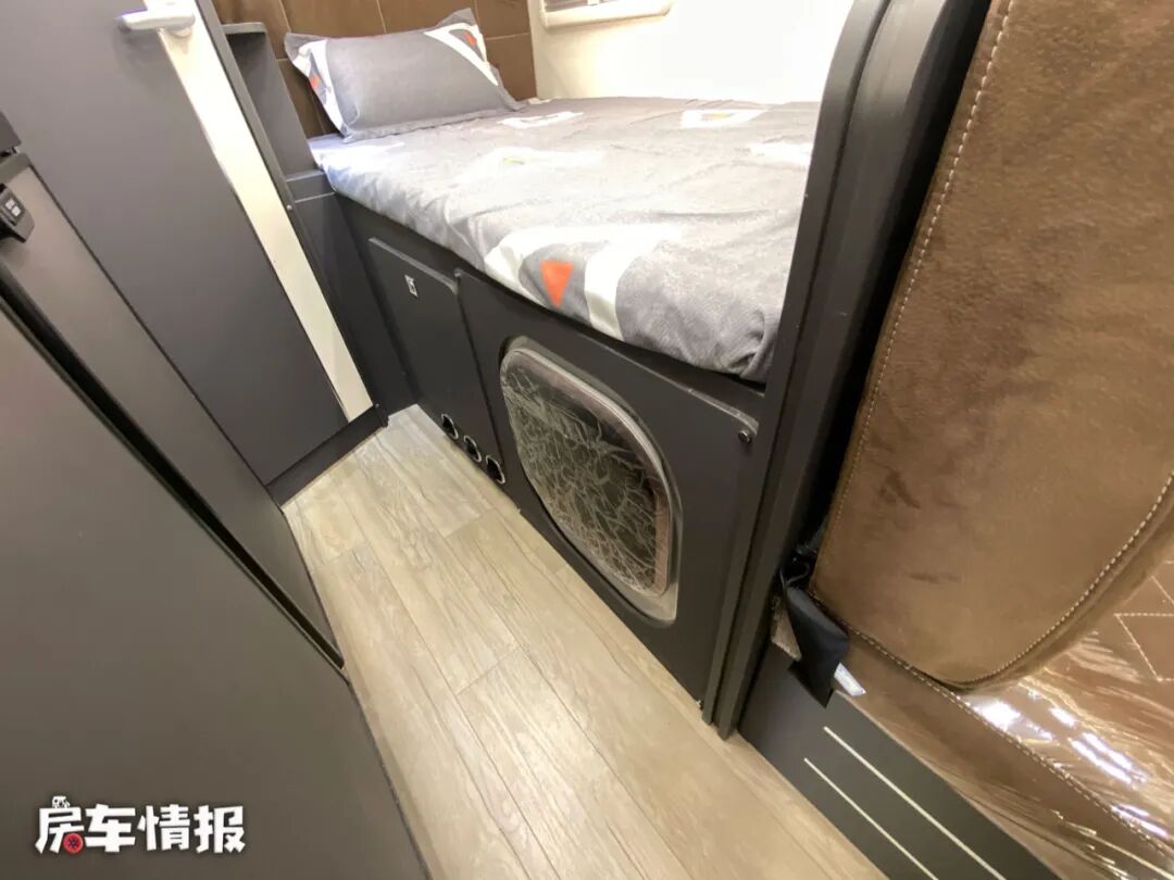 床板下方提供了一台大宇2.5kg全自动洗衣机,旁边的柜门和车身外侧的行李舱相连,平时拿取行李的时候也更加的方便。