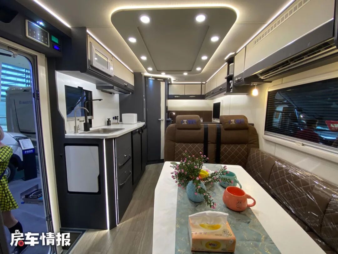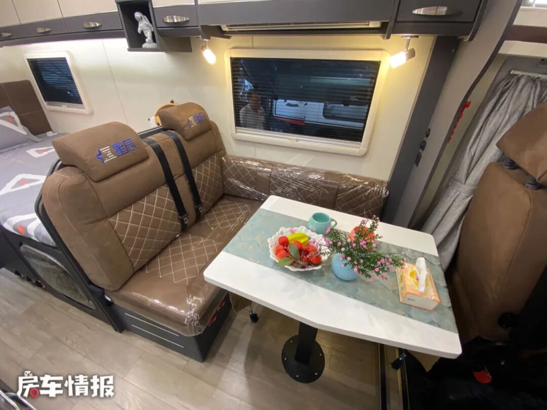前方的会客区采用了L型沙发座椅+大尺寸气动升降式6向调节餐桌的设计,并配备了两条安全带,所以整车在行驶过程中最多可乘坐4人。
