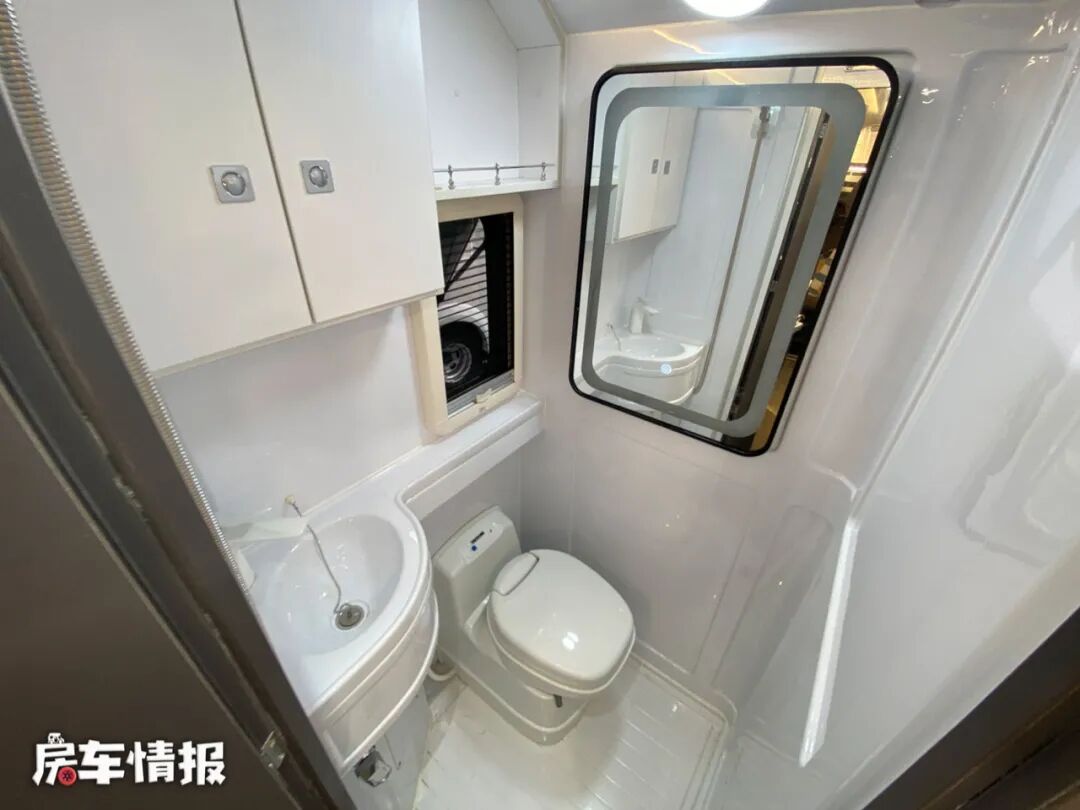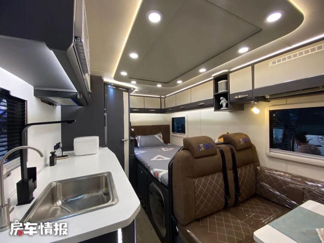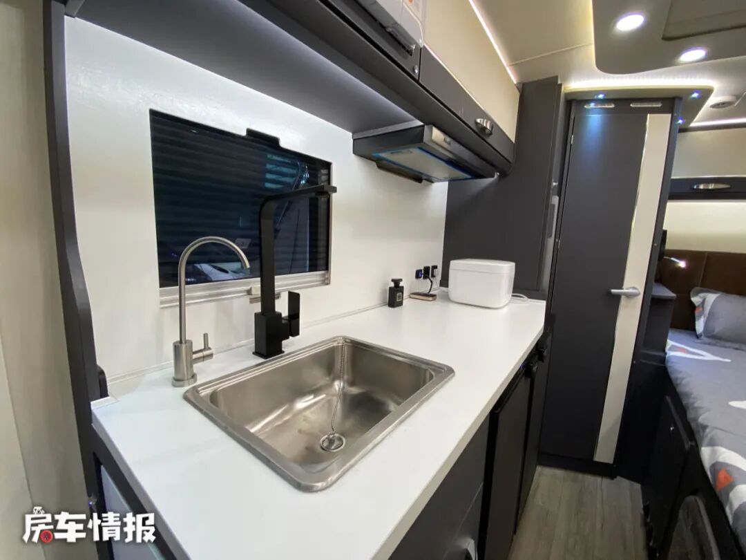 水电方面,这款房车搭载了一台3000W的逆变器,提供了1000Ah的锂电池,并配备了600W的太阳能板;水路上则提供了200L的净水箱和70L的污水箱,另外这款房车还搭载了一台云米600G净水机,可以更加安心的使用饮用水。