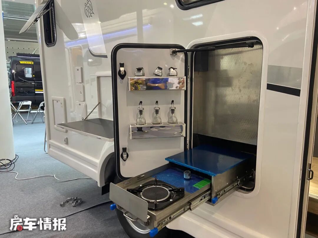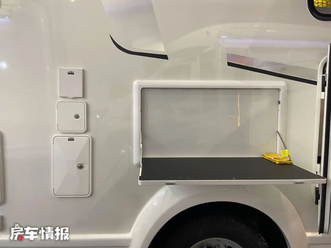车身外部的配置还是非常丰富的,包括进口的菲亚玛遮阳棚、外置翻板、抽拉式防风燃气灶、水电接驳口以及行李舱,满足平时生活所需。