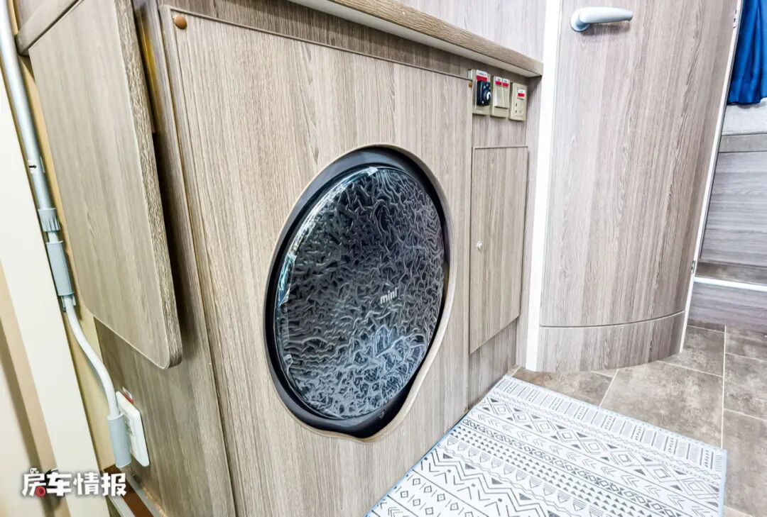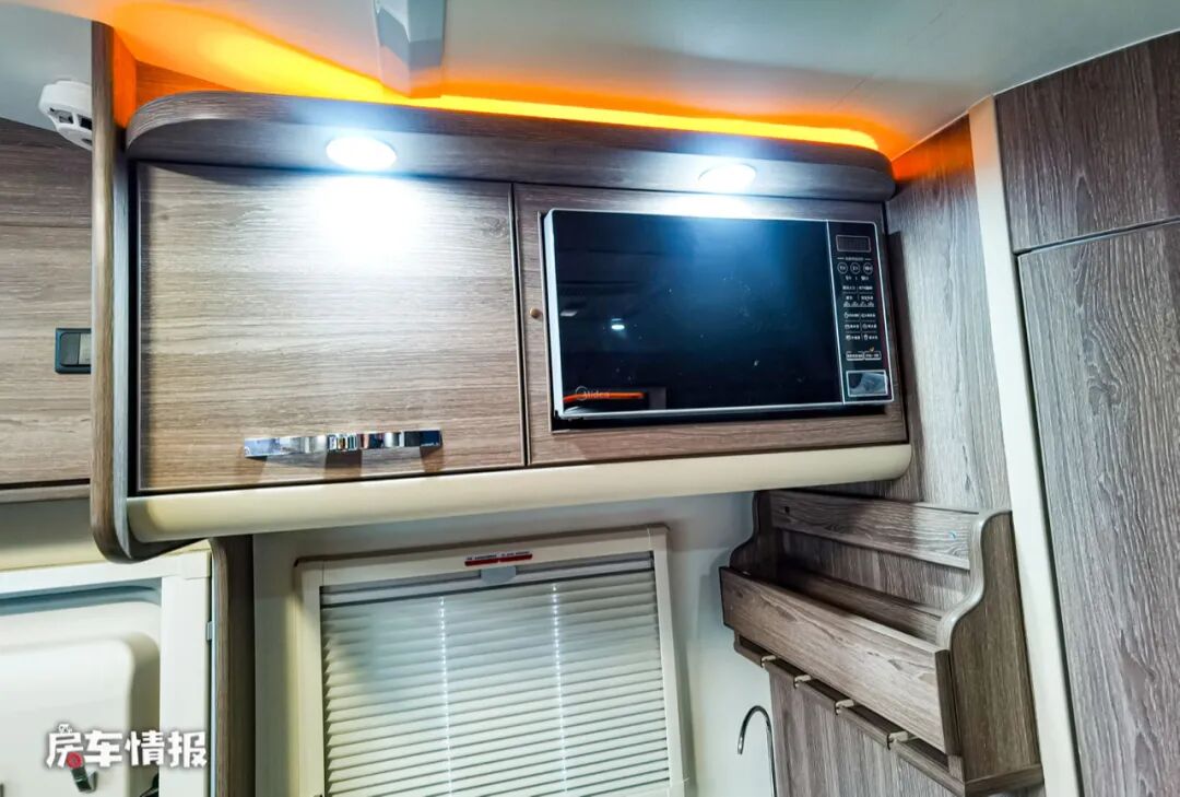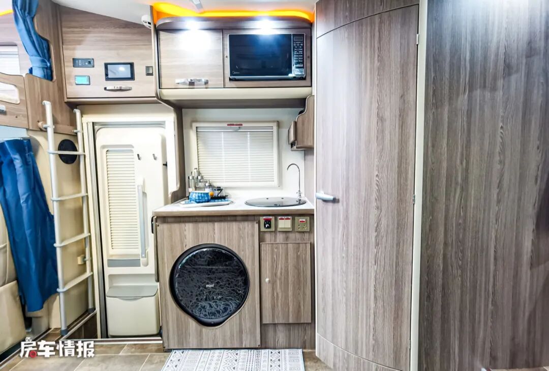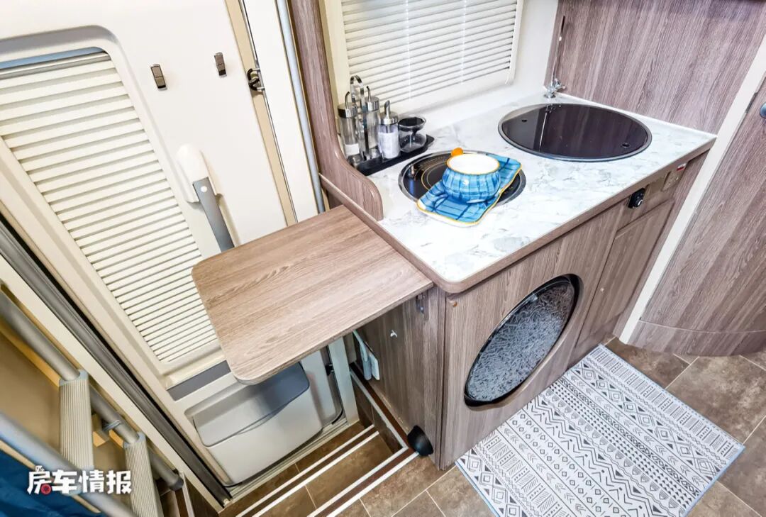 乘客门后方的厨房区也提供了比较丰富的配置,包括微波炉、置物架、电磁炉、带盖的不锈钢洗菜盆、洗衣机和储物空间,并且橱柜的侧面还增加了可拓展的折叠小桌板,方便后期使用。