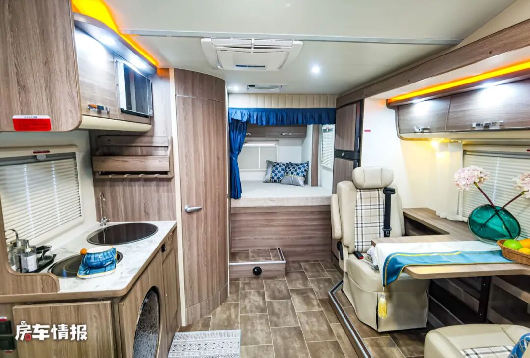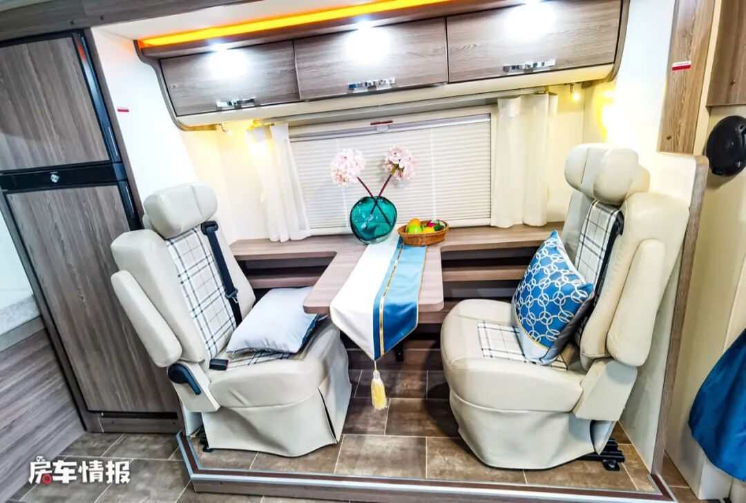 两个航空级座椅沙发不仅带有安全带,还配备了乘车扶手和头枕,即便是长途旅行也不会因此而感到疲惫,晚上需要休息的时候,还可以拓展成一张尺寸为1830mm*900mm的单人沙发,无论是睡成年人还是小朋友都完全没有问题。除此之外,在左侧拓展区域内还提供了一台142L的上下双开门的进口多美达冰箱,足够存放平时的食物。