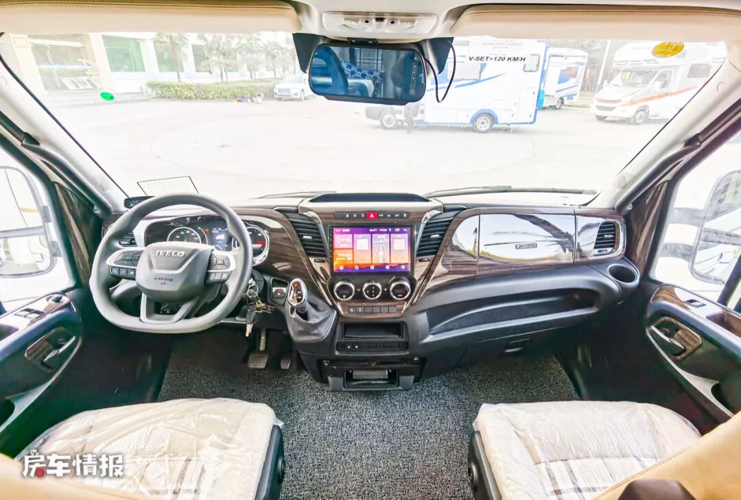 驾驶室内部相比于国产依维柯底盘的驾驶室更加的精致,中控台表面采用了更加商务的木质面板,不仅提升了美感也提升了豪华感。同时全车还配备了多功能方向盘、中控彩色触控大屏等,方便驾驶员后期操控。