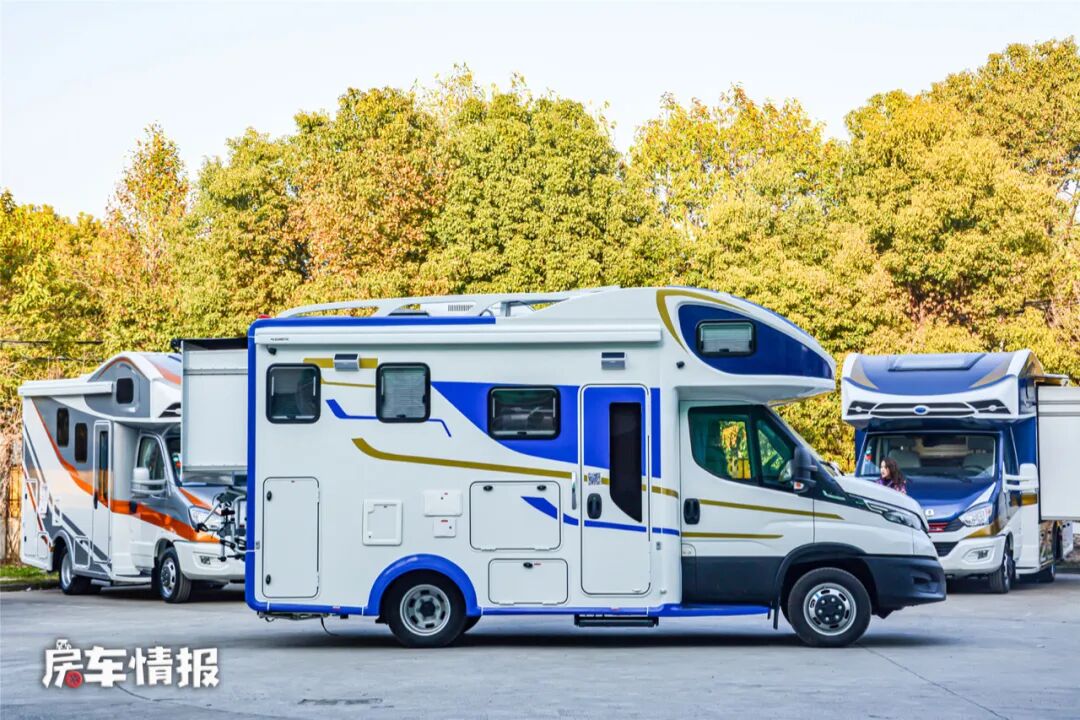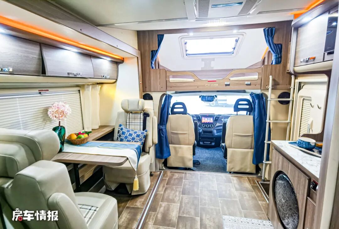 这款房车是基于4.5T的进口依维柯New Daily底盘打造的,全车的长宽高分别为5995mm*2427mm*3130mm,轴距为3450mm,全车采用了一个标准的C型房车大额头的设计,不到6米的车身长度也满足上蓝牌的规定。