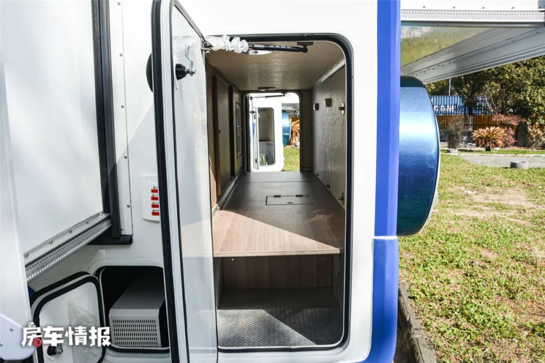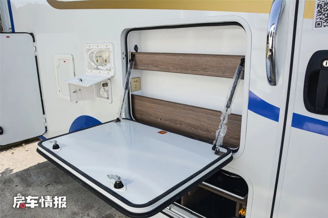 这款房车带有双拓展机构,可以增加车厢内部的生活区空间,另外车外部的配置也比较丰富,提供了3.5米的进口多美达遮阳棚、抽拉式燃气灶、左右贯通式的储物舱、外置翻板以及水电接驳口,既提供了超大的储物空间,也可以满足在车外做饭炒菜的需求,同时还能随时为车辆进行补给。