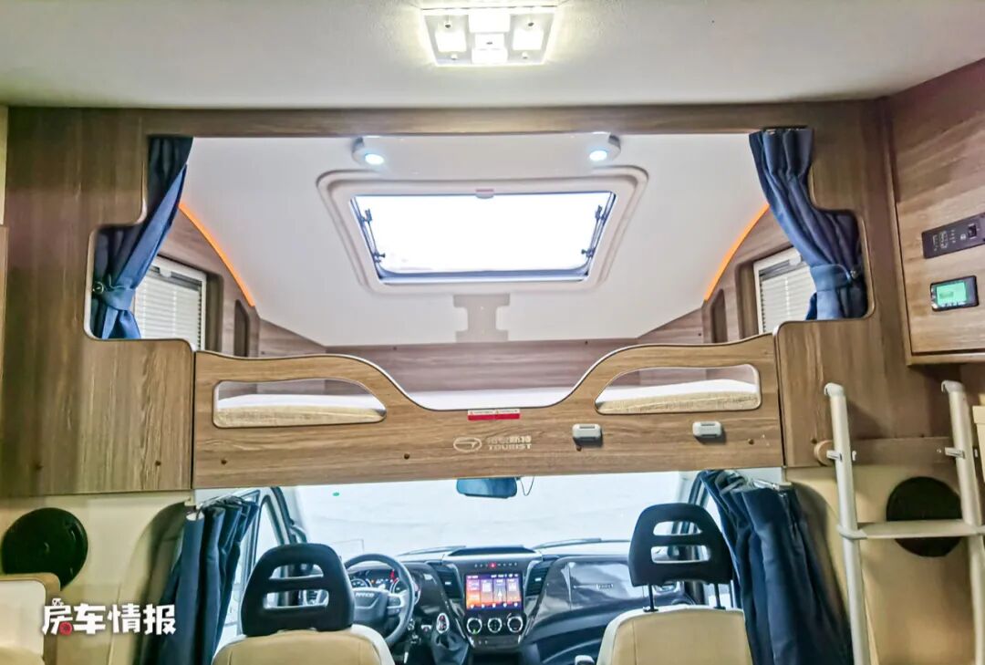 尾部的双人床尺寸为1920mm*1350mm,大小完全可以容下两名成年人,休息区三面环窗还带有遮阳拉帘,无论是采光、换气还是保护个人隐私的功能都一一兼具。