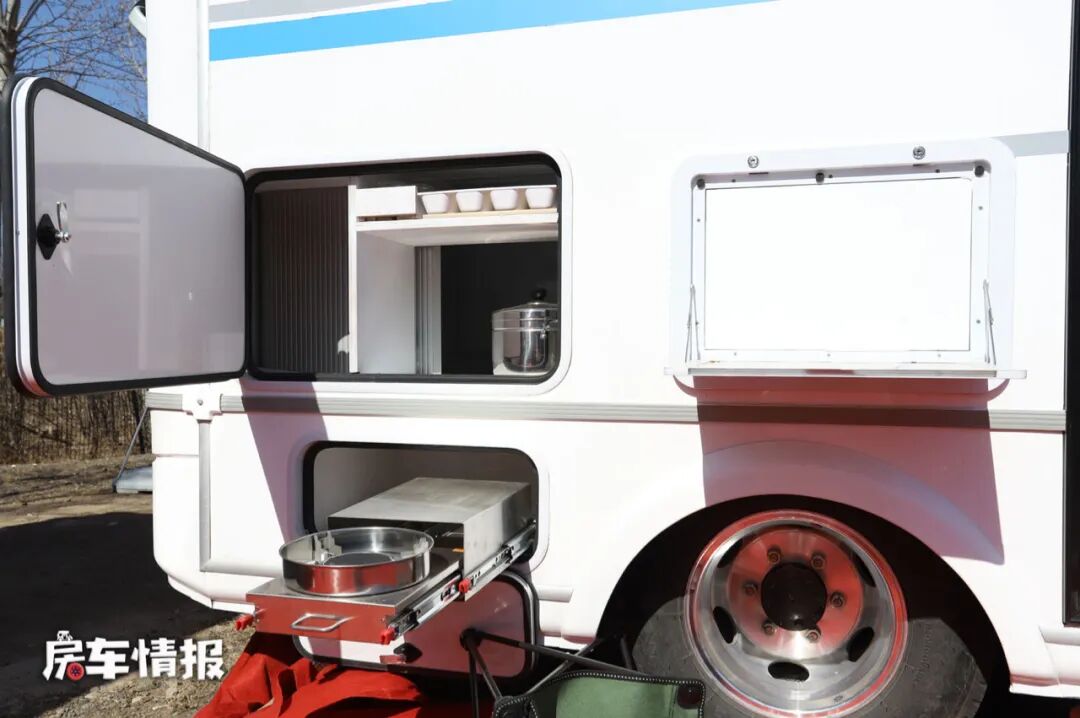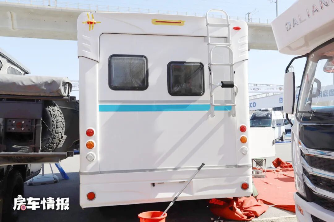 车后方的设计也很简约,配备了一部专用爬梯,方便上车检查,另外车身外侧还提供了外接注水口、市电充电口以及新能源充电接口等设施,方便平时为房车补给。
