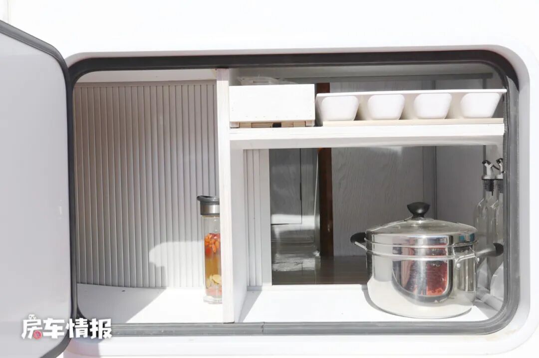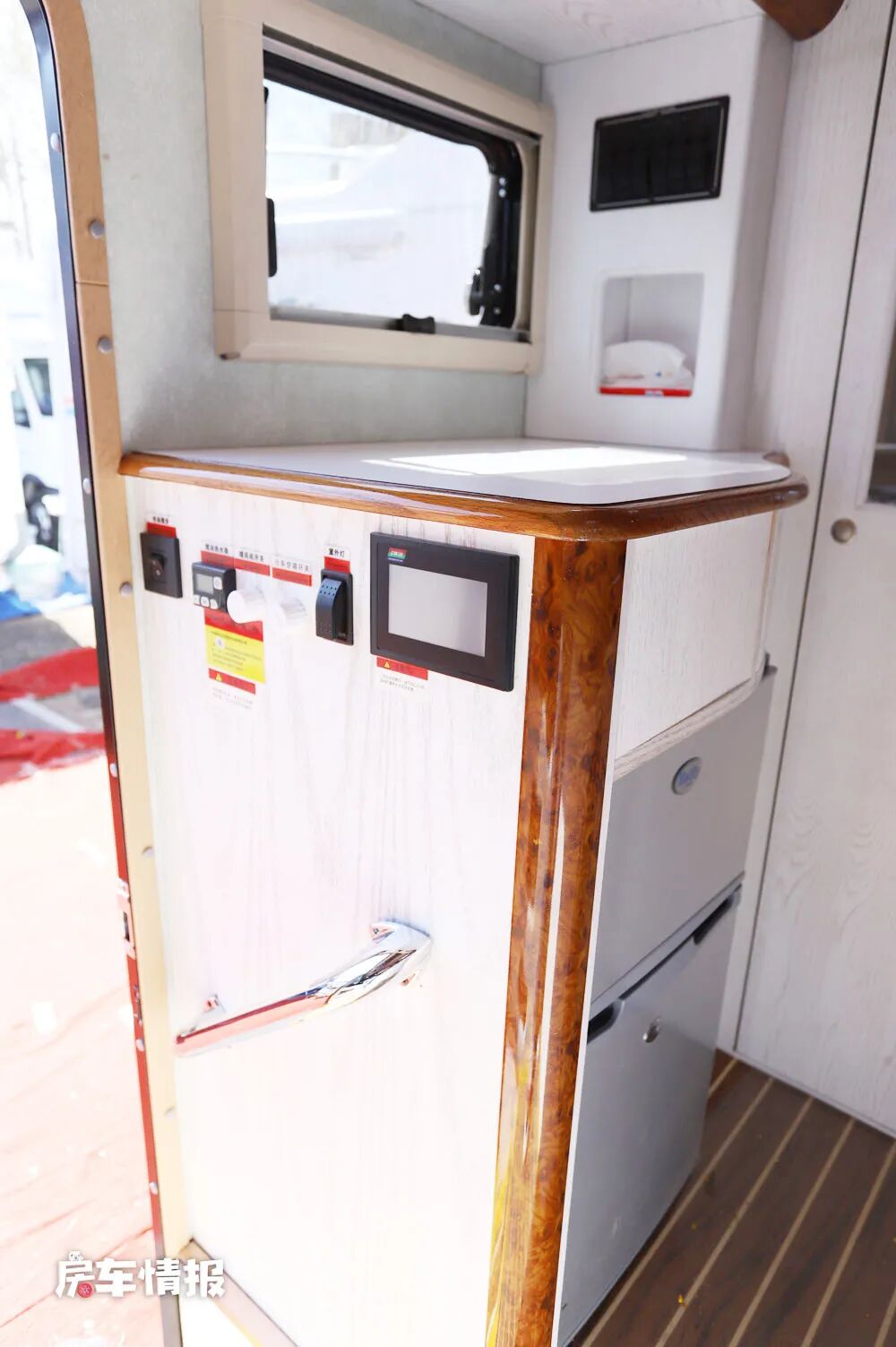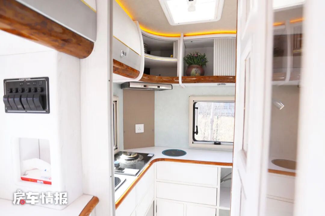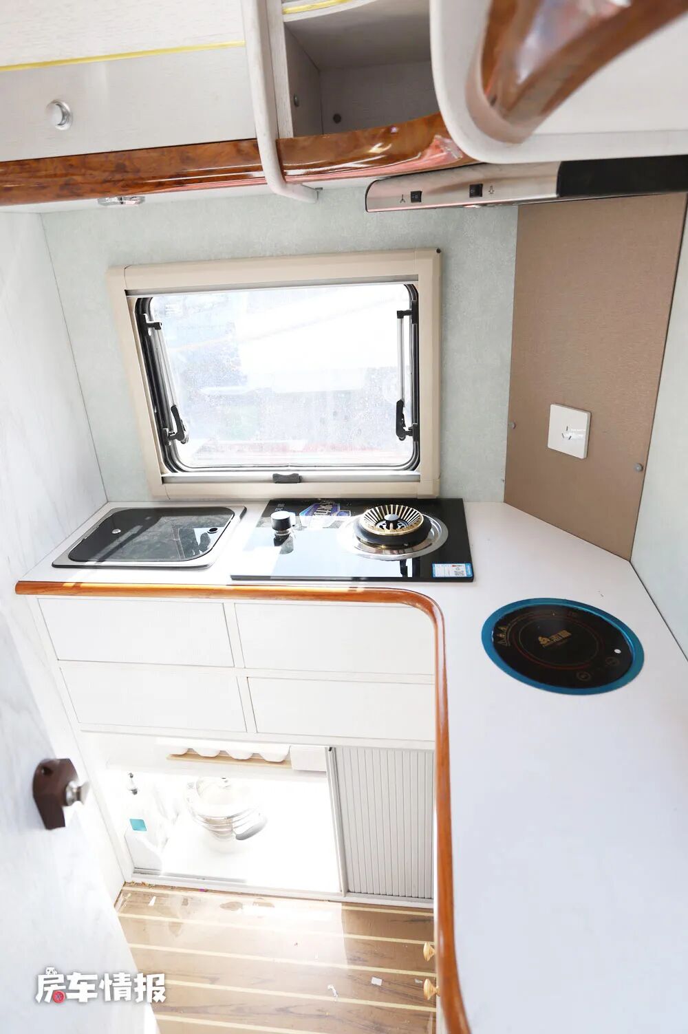另外这款房车与YJ2最大的不同是将厨房变成了一个独立的区域,内部提供了一个L型的橱柜,台面上提供了一个带盖的洗菜池、单眼燃气灶和一个电磁炉,两边都可以开火做饭,节省时间提高效率,上方还配备了一台抽油烟机,壁板上还提供了三孔插座,可以外接厨用小电器,上下方都带有储物空间,非常像家里的小厨房。